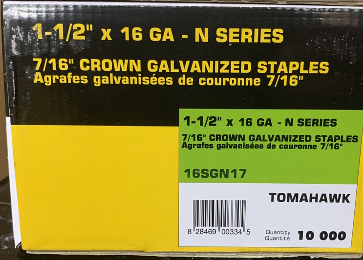 N17 Staples 1-1/2" Brand will vary. Applications include Sheathing, subflooring, roof decking, lathing, sub-components, cabinet backs, door manufacturing furring, window units, fencing, decking, ridge beams, pallets, apiaries, crate and box assembly and light furniture framing, etc.