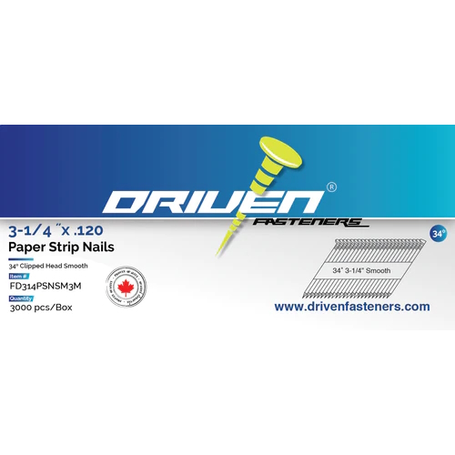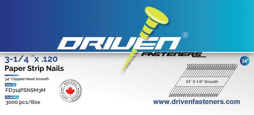 The paper strip nails are 34 degree angle, collated with a paper strip. 3-1/4" length, made of .120" (11 gauge) smooth shank non galvanized brite steel, they are commonly used for wood framing applications Not recommended for ACQ Treated Lumber. Our clipped head 34 degree angle 3-1/4" gun nails are compatible with 30-34 degree angle framing nailers. 3000/box.
