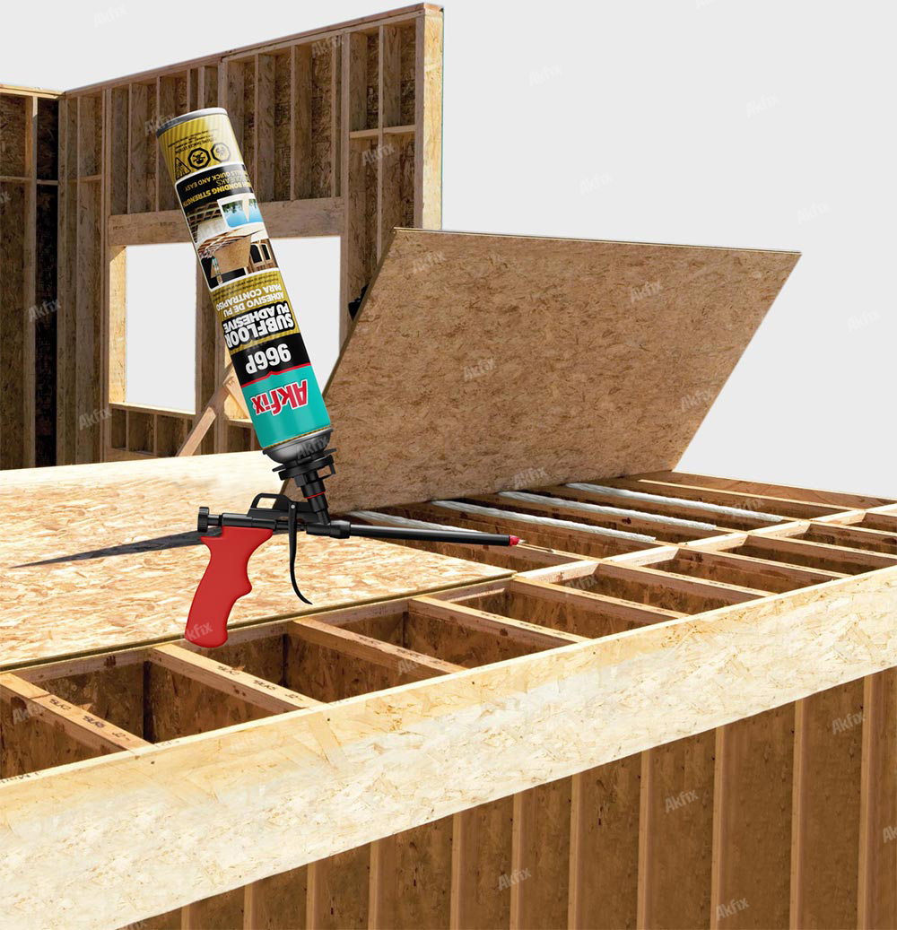 Subfloor Adhesive is a one-component premium polyurethane-based new generation adhesive formulated for floor joists, subflooring, trusses, particle board, OSB and decks. Subfloor Adhesive provides superior adhesion to lumber, plywood, concrete, metals, masonry and other substrates even if they are frozen or slightly damp.