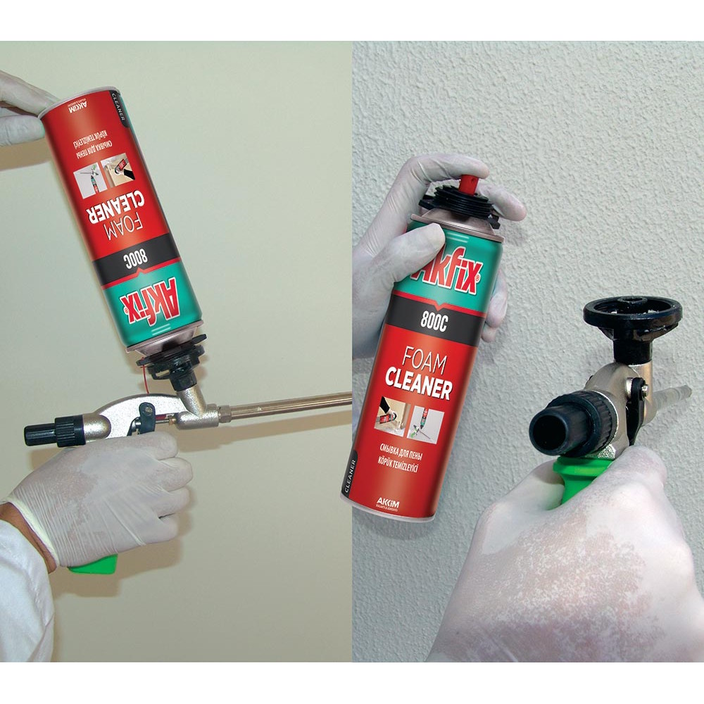Akfix 800C removes fresh PU foam and cleans the PU foam gun adapter after the application. Cleans surfaces, clothes, window & door frames and prevents the foam cure in the gun adapter.