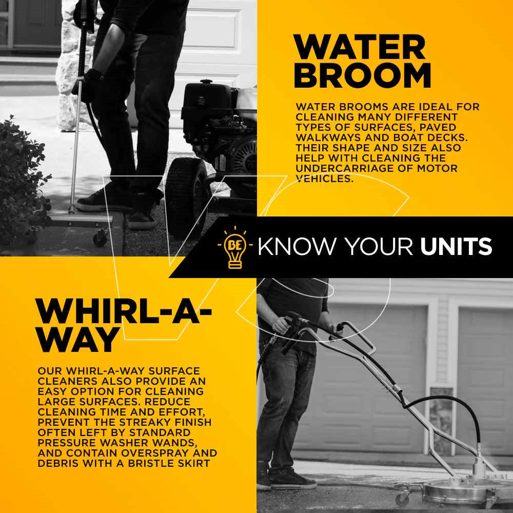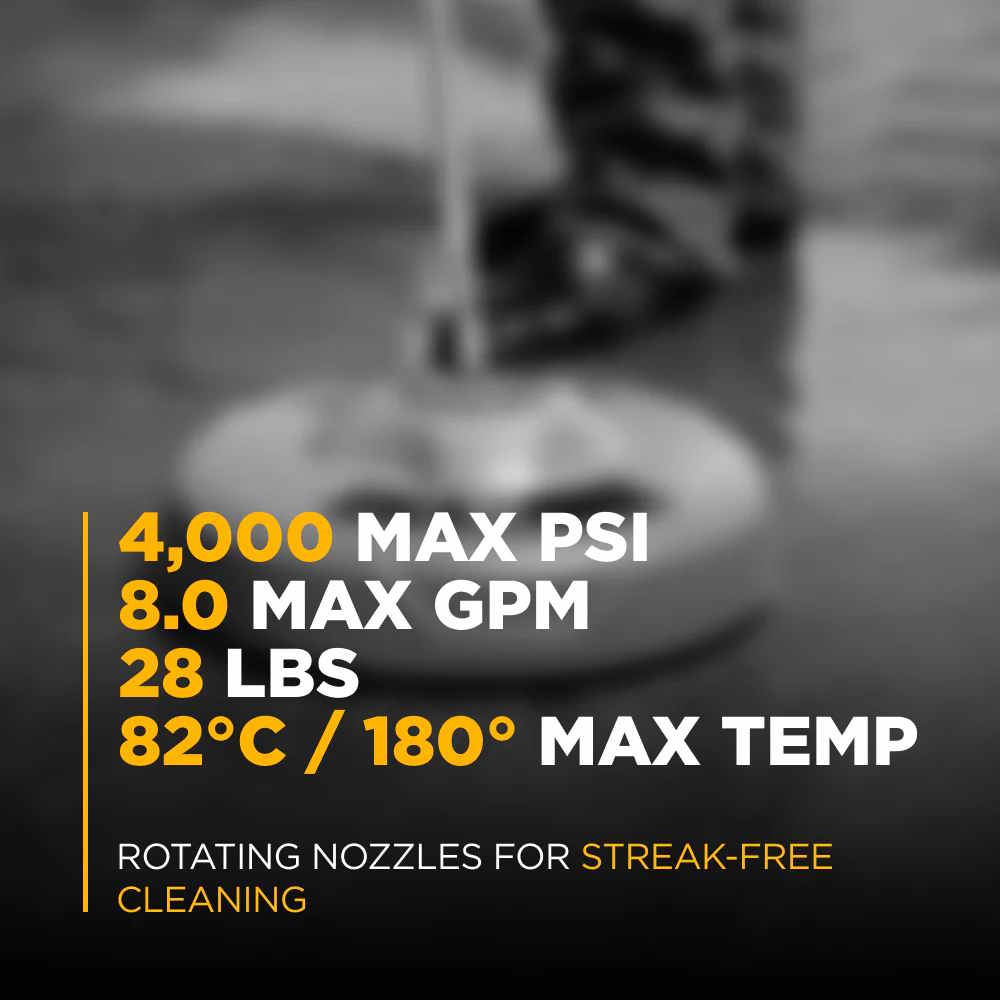 One of the best attachments for a pressure washer to clean large flat surfaces. The two rapidly spinning jets create a large, streak-free cleaned path greatly reducing the time and effort needed for projects such as parking lots, driveways and sidewalks.