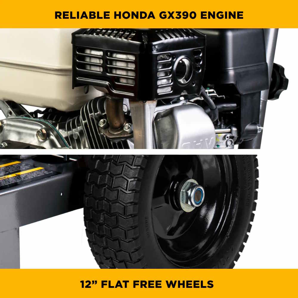 The BE Power Equipment B4213HAAS is a 4,200 PSI / 4.2 GPM commercial use pressure washer. With its durable Aluminum frame, 12” flat free tires and easy tilt back design, this machine will tackle any of your hard to clean surfaces, stains and grime. Reliable Honda 389cc engine, AR Triplex Pump and 50ft steel braided rubber hose gives you a long lasting complete unit you can rely on for years to come. This Gas Pressure Washer is backed by Industry leading 3-year warranty.
