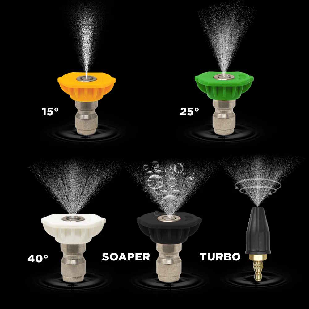 Includes spray wand, 0°, 15°, 25° & 40° high-pressure nozzles, rotary turbo nozzle, high pressure soap foam cannon and 25 foot hose.