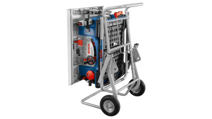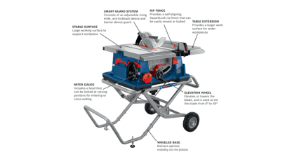 The Bosch 4100XC-10 10 In. Worksite Table Saw with Gravity-Rise Wheeled Stand delivers both professional rip capacity and outstanding portability for a tool that can get the job done, wherever it is. The powerful 15-Amp saw delivers 4.0 max HP for outstanding productivity. It also incorporates soft-start circuitry for smooth but quick ramp-up to the operating speed. It includes Constant Response circuitry to help maintain speed under load, restart protection to avoid accidental startup and overload protection. The SquareLock rip fence is engineered for maximum trueness and great ease-of-use. It includes an enhanced auxiliary fence for narrow workpieces. The lighter GTA47W Gravity-Rise Wheeled Stand has 8 In. treaded rubber-composite tires and a single-action design for easy set-up and transport. It is jobsite-ready with heavy-duty construction. The Smart Guard System features a three-position adjustable riving knife, anti-kickback pawls and non-obstructed-view barrier guard assembly. The table saw provides a 30 In. x 22-1/2 In. tabletop with a 30 In. rip capacity for ripping 4 Ft. wide sheets goods in half.