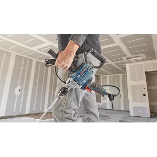The Bosch GBM9-16 Mixer handles a wide variety of materials, from paint to plaster and more. It has variable speed control, and it has both forward and reverse operation at 0-700 no-load RPM. The all-ball bearing motor and precision-cut steel gears deliver plenty of power for high-torque mixing jobs. Higher speed is best for materials with low viscosity such as paint or sealing compounds. Lower speed, higher torque mixing works for mortar or epoxy resin. It features a 360° rotatable D handle, for maximum comfort. It diminishes vibration while allowing the user to adjust to the desired position. The heavy-duty 5/8 In. keyed chuck allows the tool to support a large variety of accessories. It features a tough, lightweight magnesium front housing for durability. It has a two-finger trigger design for easier mixing.