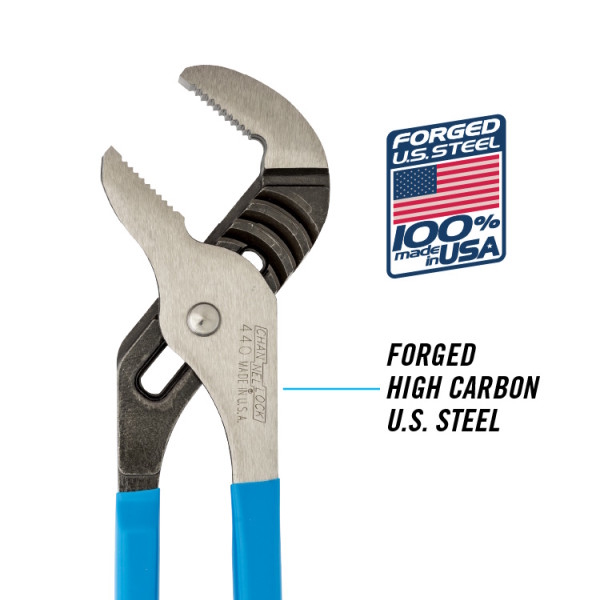 CHANNELLOCK® Straight Jaw Tongue & Groove Pliers are built to last with a PERMALOCK® fastener to eliminate nut and bolt failure, patented reinforcing edge to minimize stress breakage and laser-hardened teeth to provide a better, longer lasting grip. CHANNELLOCK® Straight Jaw Tongue & Groove Pliers are made in USA and forged from high carbon U.S. steel that is specially coated for ultimate rust prevention.