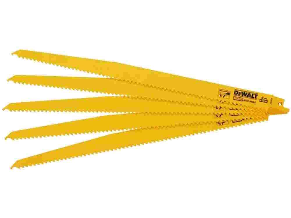 With a 6-degree hook angle for fast, aggressive cuts, DEWALT Wood Cutting Reciprocating Saw Blades feature a reinforced tooth for additional strength when cutting through nails and other foreign objects. Raker tooth design helps to increase contact area for fast cuts. A specially formulated anti-stick coating minimizes friction and gum-up.