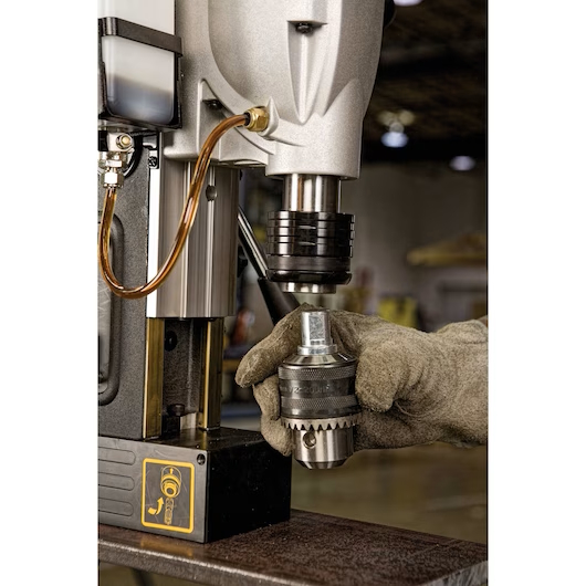 The DWE1622K 2" 2-Speed Magnetic Drill Press has a 10 Amp motor with 2 speed settings and overload protection to prevent motor damage. Quick Change Chuck system allows for tool free change between 3/4" Weldon Shank and 1/2" keyed chuck.