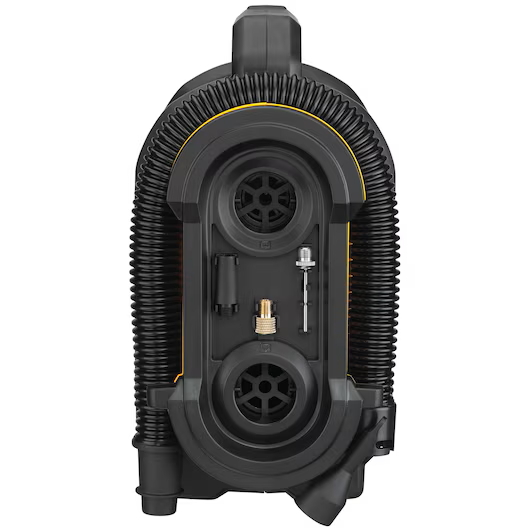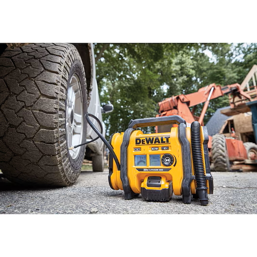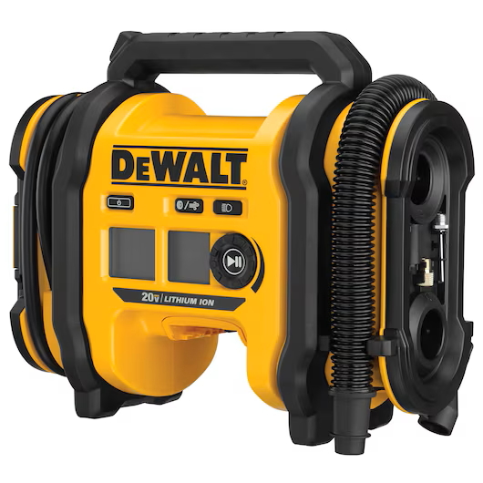 Dewalt's 20V MAX* Corded/Cordless Air Inflator can run on any one of three power sources** for maximum versatility: 20V MAX* battery, 12V DC, or 110V AC. Use it on the jobsite, or on the go. It features a high-pressure rubber hose for durability. The threaded chuck and included onboard accessories make it easy to inflate items from tires to footballs. Setting desired air pressure is simple with the digital gauge, and the auto-shutoff provides accurate inflation. The high-volume hose allows fast inflation of mattresses and other inflatables with the push of a button. Move the hose to the deflation port for quick and easy take down. An onboard LED light helps to provide illumination in dark spaces. Heavy-duty rubber feet help reduce walking while in use. **Battery, charger, and AC power adapter sold separately.