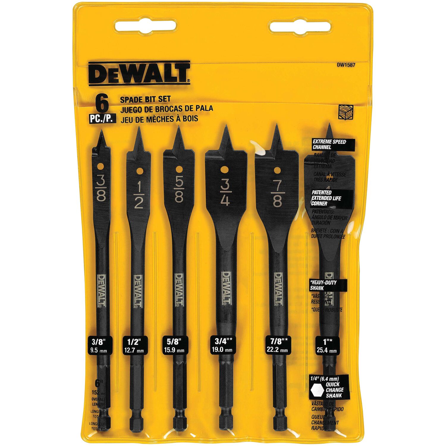 These DEWALT® Spade Bits feature Extreme Speed Channels for fast chip removal and heavy-duty shanks for durability. This set includes six commonly used spade drill bit sizes to for variety of applications. The dual, precision-ground cutting edges deliver maximum speed and performance. The patented corner design helps preserve life and protect against nail impact. A 1/4 in. ball groove shank is compatible with most drills.