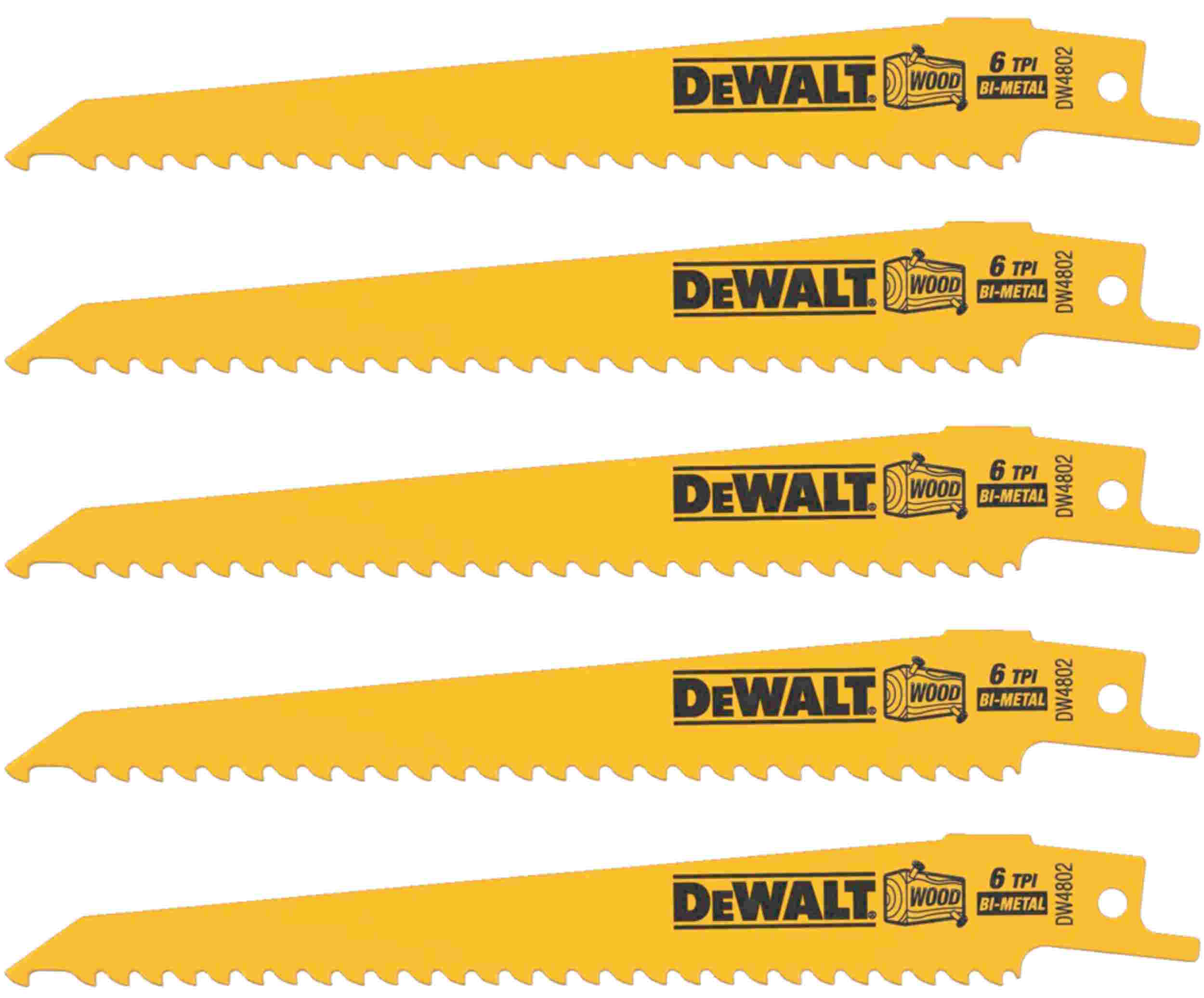 DEWALT 9" 6 TPI Taper Back Bi-Metal Reciprocating Blade for General Purpose Wood Cutting (5 pack)