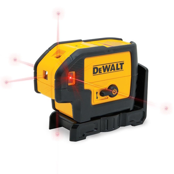 The DW085K 5 Beam Laser Pointer includes a single lever power switch locks pendulum in the off position for added durability and a built-in magnetic pivoting bracket, which mounts easily on metal surfaces.