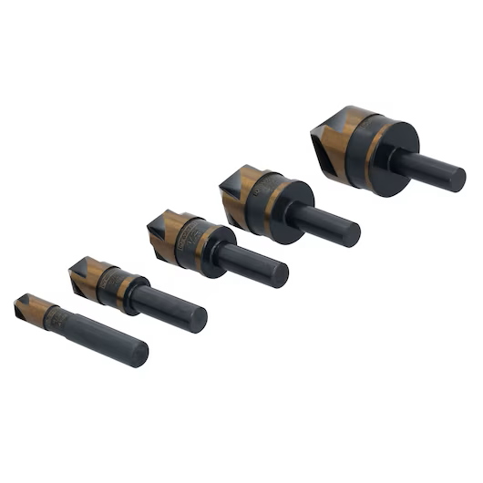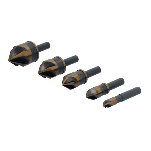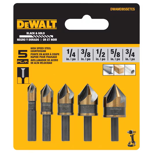 Complete countersink applications with this DEWALT® High-Speed Steel Countersink Drill Bits. Engineered for use in many common materials, these durable, corrosion-resistant black and gold bits feature an 82º tip making them ideal when working with metal, wood, and plastic. A 5-flute design allows for smooth drilling while helping to provide long bit life and minimize friction. Available as a 5-piece set or in the following individual sizes: 1/4 in., 3/8 in., 1/2 in., 5/8 in., and 3/4 in.