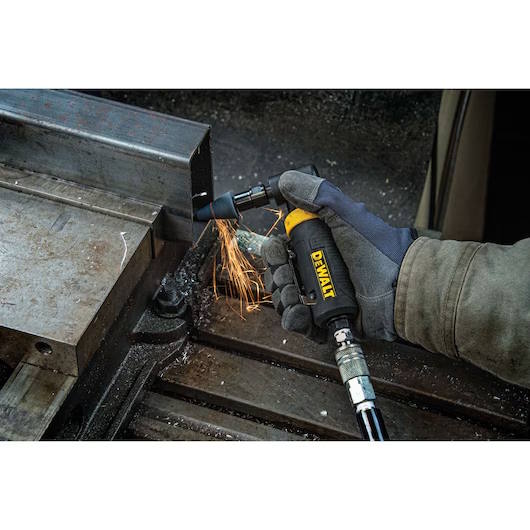 The 1/4" Angle Die Grinder features a lightweight aluminum body with an ergonomically designed cushion grip for user comfort. It features a touch control trigger with a self-locking throttle to provide protection from accidental start ups.