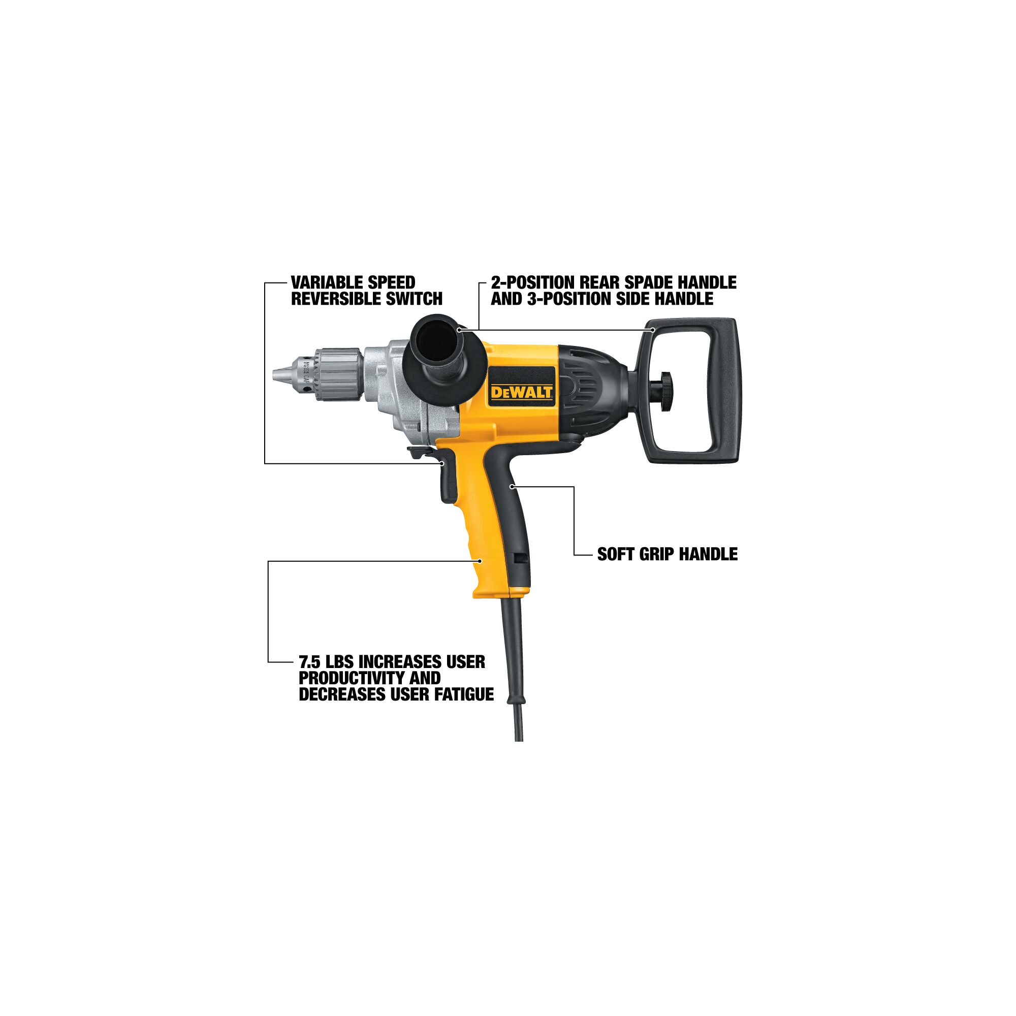Variable speed reversible switch reduces air bubbles when mixing mud and offers greater control when drilling 0-550 RPM provides increased torque for drilling and mud mixing 9.0 AMPS, 120V motor provides enough power for any job site application 7.5 lbs. (3.4 kg) increases user productivity and decreases user fatigue Soft grip handle for increased comfort 2-position rear spade handle and 3-position side handle gives greater control for all drilling and mixing applications