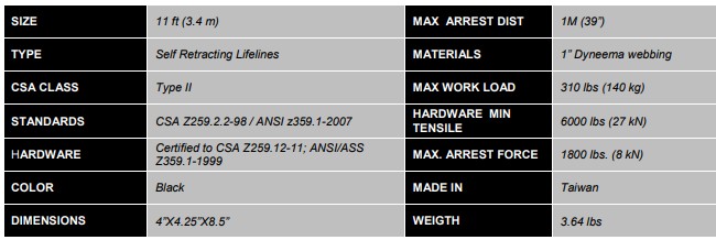 Webbing Self-Retracting Lifeline CSA Class SRL, with Small Snap Hook and Triple Action Carabiner - 11' (3.4m)