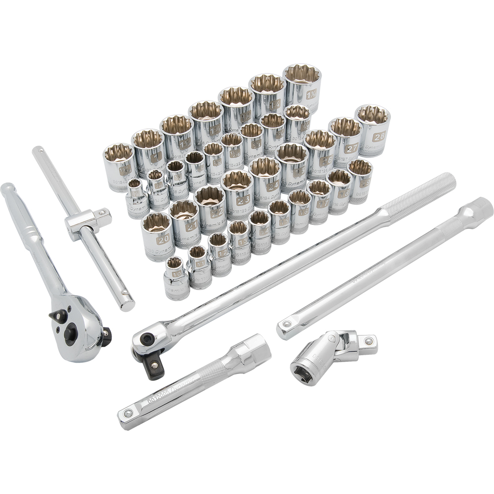 Contains: 16 Standard SAE Sockets: 3/8, 7/16, 1/2, 9/16, 5/8, 11/16, 3/4, 13/16, 7/8, 15/16, 1, 1-1/16, 1-1/8, 1-3/16, 1-1/4, 1-5/16, 19 Standard Metric Sockets: 10, 11, 12, 13, 14, 15, 16, 17, 18, 19, 20, 21, 22, 23, 24, 25, 26, 27, 28mm, 5 & 10 Extensions, 45 Tooth Ratchet, Universal Joint, Flex Handle, T-handle, Drive Type: 12 Point