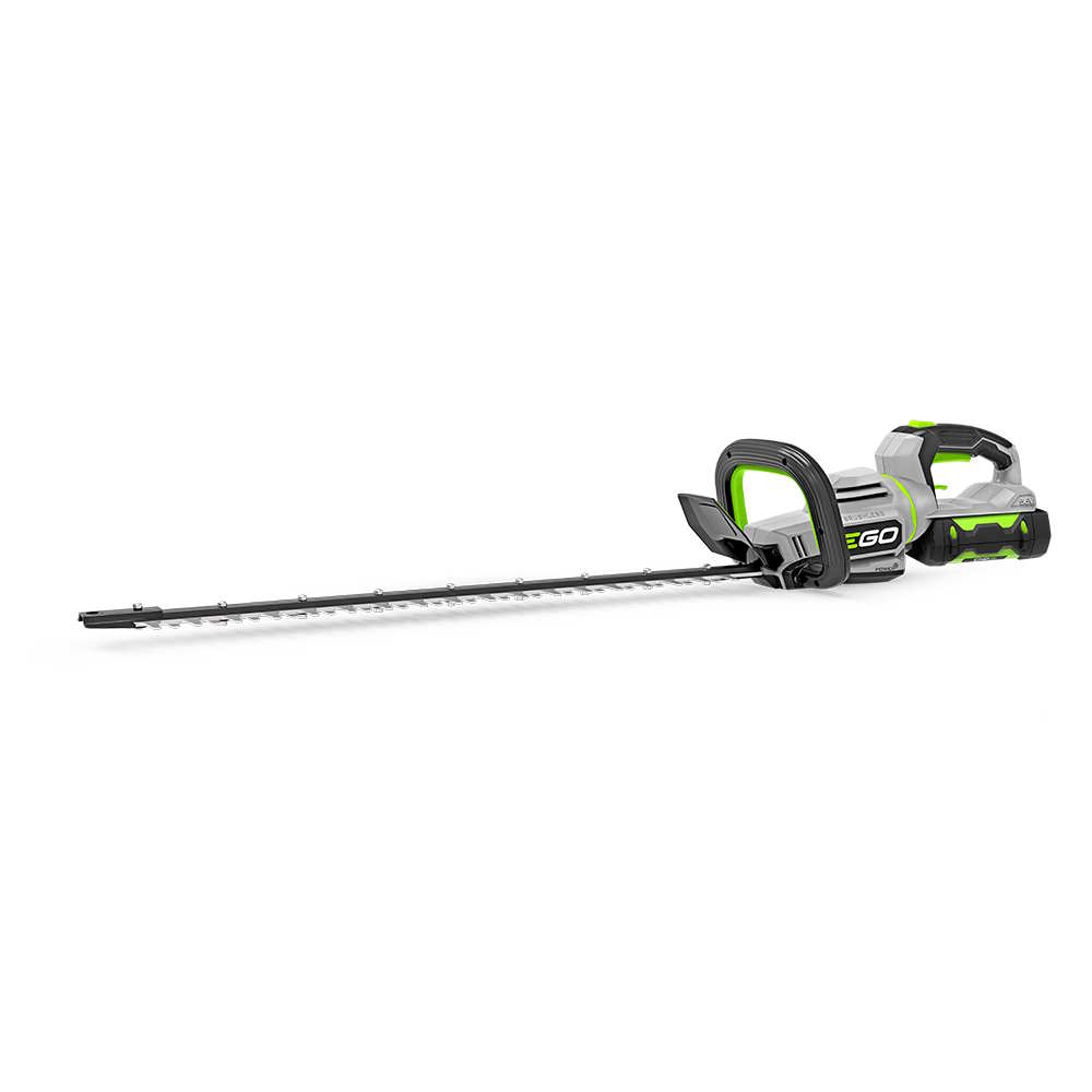 The EGO POWER+ 26” Hedge Trimmer features dual-action blades that deliver up to 3,400 strokes per minute for fast, clean cuts. Its strong and light carbon fiber rail is an industry first, delivering ultimate durability, backed by a lifetime warranty. The hedge trimmer features a five-position, 180-degree rotating handle that delivers ultimate control. This cordless hedge trimmer has a 1.2-inch cut capacity to tackle thicker branches along with a serviceable gearbox to make blade sharpening quick and easy. Its high-efficiency brushless motor delivers long runtime, low vibrations, and extended tool life. IPX4-rated weather resistance delivers protection from the elements. Powered by an EGO 56V ARC Lithium™ battery, this cordless electric hedge trimmer delivers up to 60 minutes of runtime on a single charge with the included 2.5Ah battery.