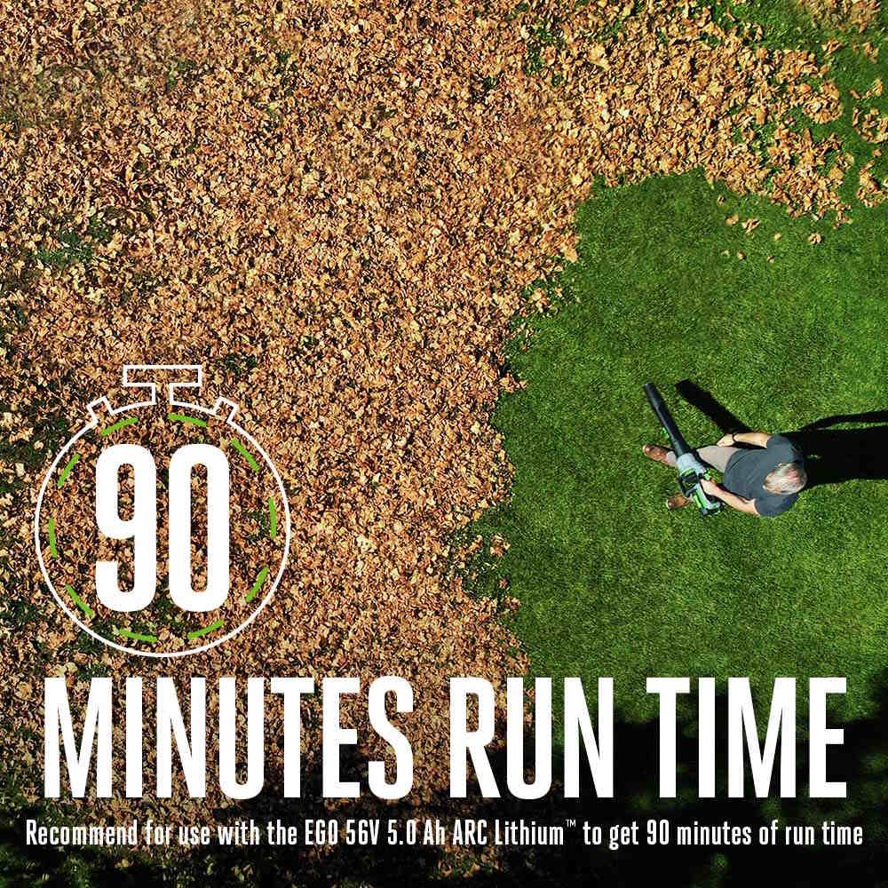 Up to 90 minutes of average run time: 15 mins on Turbo, 150 minutes on low with recommended 5.0Ah ARC Lithium™ battery
