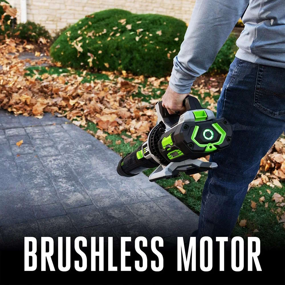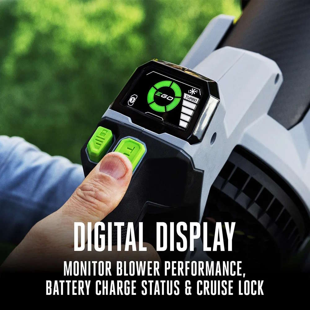 The EGO POWER+ 880 CFM Cordless Blower is our most powerful handheld blower, delivering up to 880 CFM and air speeds up to 200 MPH. It features a digital display to monitor blower speed, battery charge status, and cruise lock in real time. Use the variable speed trigger to adjust your airflow from 270 CFM to 700 CFM for ultimate control. Activate turbo mode when you need to power through heavy debris including wet leaves, rocks, mud, and snow to unleash 880 CFM and up to 200 MPH with the tapered nozzle attached. This cordless leaf blower features a high-efficiency brushless motor that delivers long runtimes, low vibration, and an extended motor life. The turbine fan engineering, inspired by advanced aeronautics technology, performs better than premium gas leaf blowers. The lightweight carbon fiber body makes this cordless blower extra lightweight durable. The included tapered and spread nozzles make clearing debris in all conditions easy, and IPX4 weather-resistant construction delivers protection from the elements. The cordless electric blower delivers up to 90 minutes of average runtime with two included 4.0Ah ARC Lithium™ batteries. The kit includes the cordless blower, (2) 4.0Ah batteries, 320W charger, tapered nozzle, spread nozzle, and shoulder strap. Experience Power Beyond Belief™ with the EGO POWER+ 880 CFM Cordless Blower.