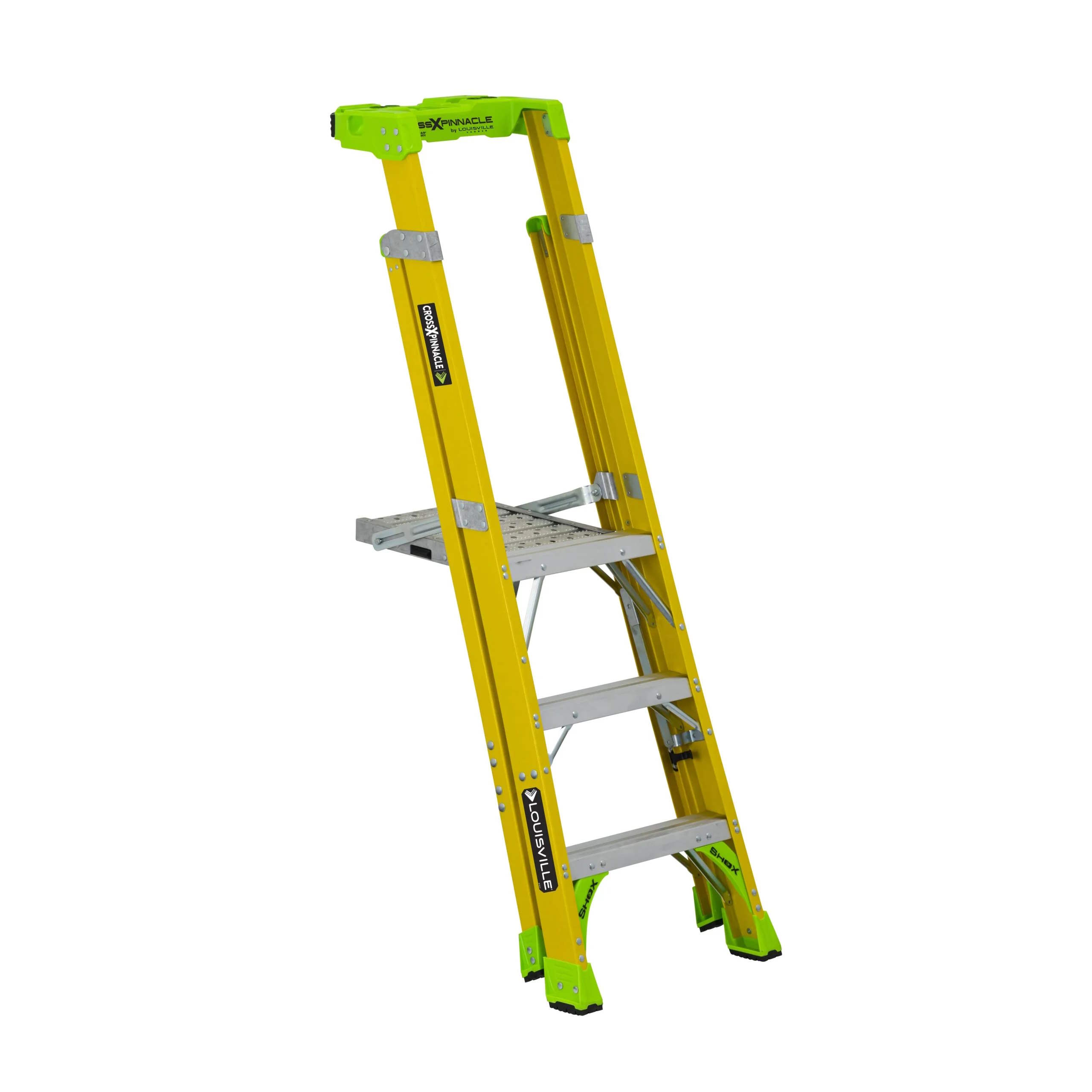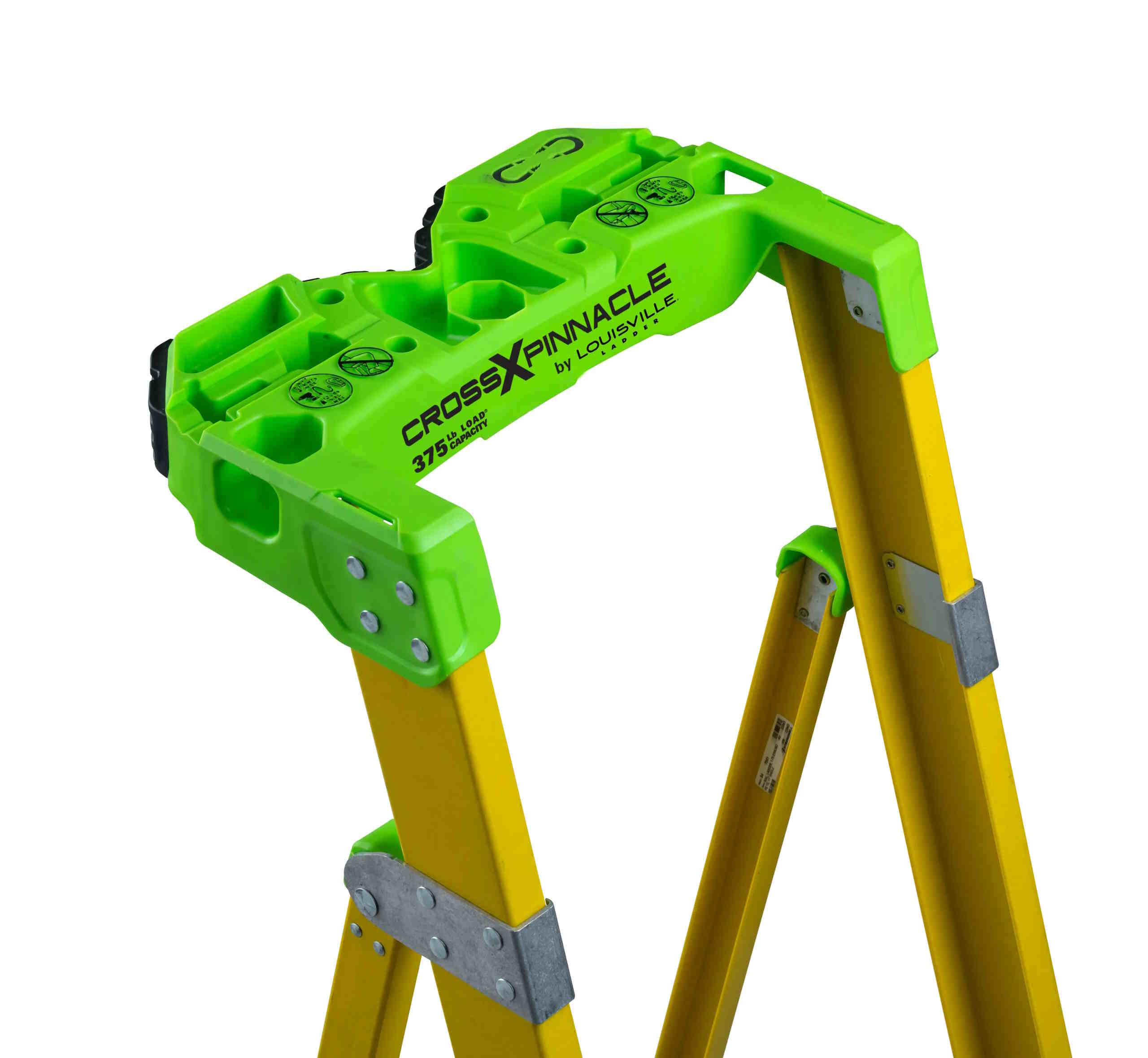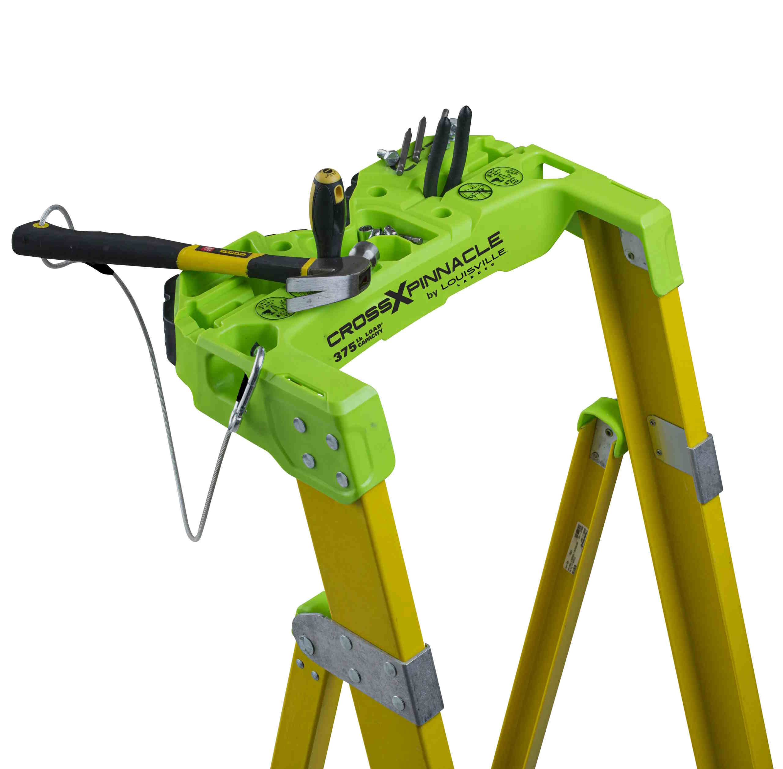This innovation is the first of its kind. Combining the sturdiness of a platform ladder with the ability to be leaned, this Platform to Leaning 2-in-1 Cross Pinnacle Ladder is a job site must-have. Its HiVis green top and shoes make it easily identifiable to prevent fines and improve workplace safety. This 4-Foot Leaning Platform Ladder is made of superior quality and is non-conductive. The V-shape Pro Top™ allows the ladder to lean against walls, buildings and poles, and onto and into corners, giving it plenty of ways to improve performance when working electrical, construction, and residential jobs. The top includes a magnet tray, hardware tray, drill and tool slots, and pipe or 2×4 holder, and two tool tether anchor attachment points to secure tools with a lanyard. Louisville Ladder’s exclusive SHOX™ system provides extra durability and resistance to abuse and accidental mishandling; it has a 375-Pound capacity, elegant design, and a smooth finish. You won’t find a more durable, reliable ladder. As with all Louisville Ladders, it meets or exceeds the safety standards set by ANSI and OSHA.