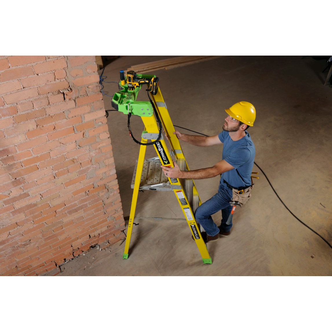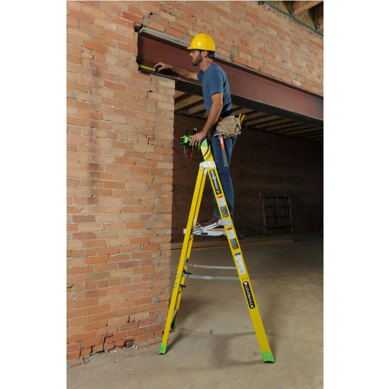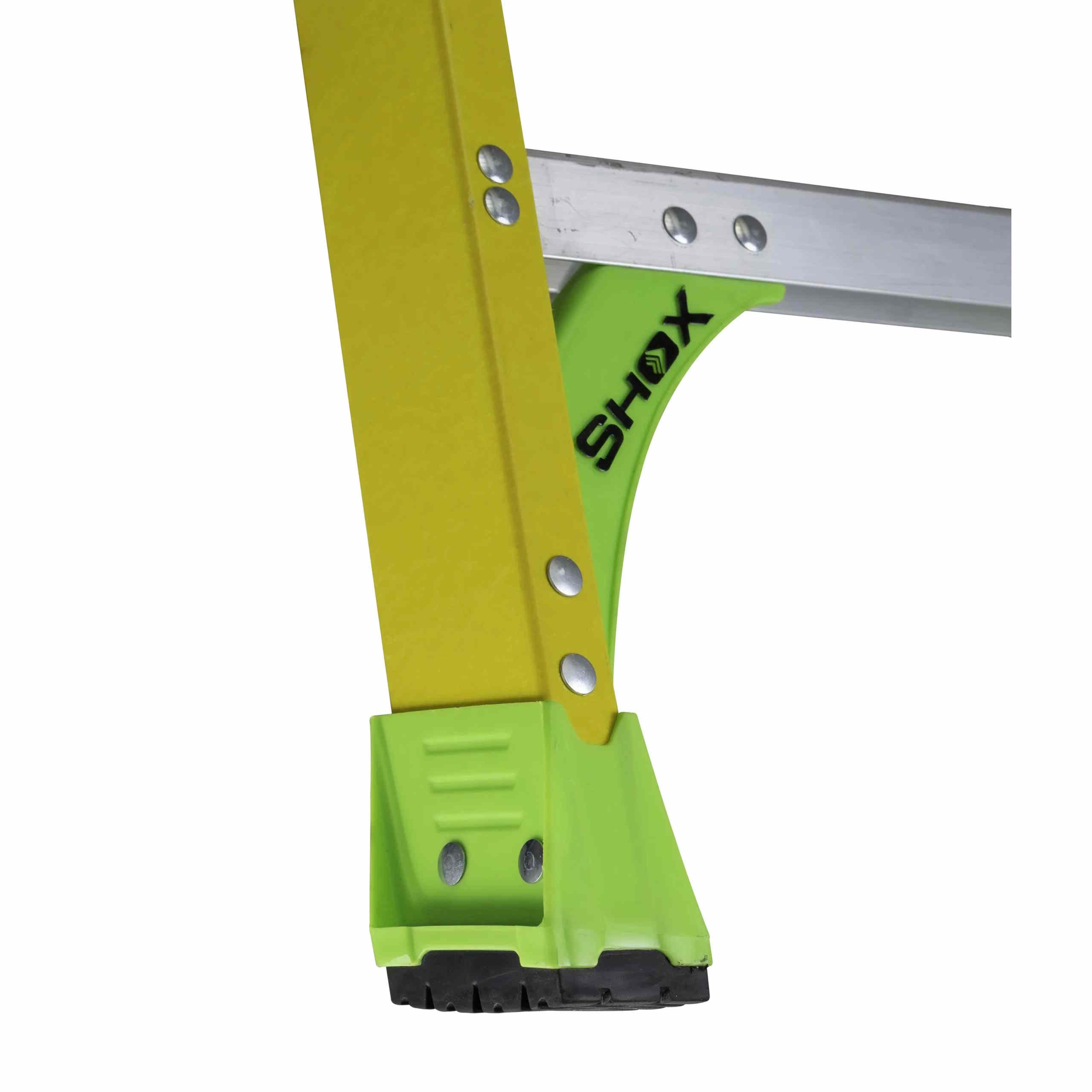 This innovation is the first of its kind. Combining the sturdiness of a platform ladder with the ability to be leaned, this Platform to Leaning 2-in-1 Cross Pinnacle Ladder is a job site must-have. Its HiVis green top and shoes make it easily identifiable to prevent fines and improve workplace safety. This 4-Foot Leaning Platform Ladder is made of superior quality and is non-conductive. The V-shape Pro Top™ allows the ladder to lean against walls, buildings and poles, and onto and into corners, giving it plenty of ways to improve performance when working electrical, construction, and residential jobs. The top includes a magnet tray, hardware tray, drill and tool slots, and pipe or 2×4 holder, and two tool tether anchor attachment points to secure tools with a lanyard. Louisville Ladder’s exclusive SHOX™ system provides extra durability and resistance to abuse and accidental mishandling; it has a 375-Pound capacity, elegant design, and a smooth finish. You won’t find a more durable, reliable ladder. As with all Louisville Ladders, it meets or exceeds the safety standards set by ANSI and OSHA.