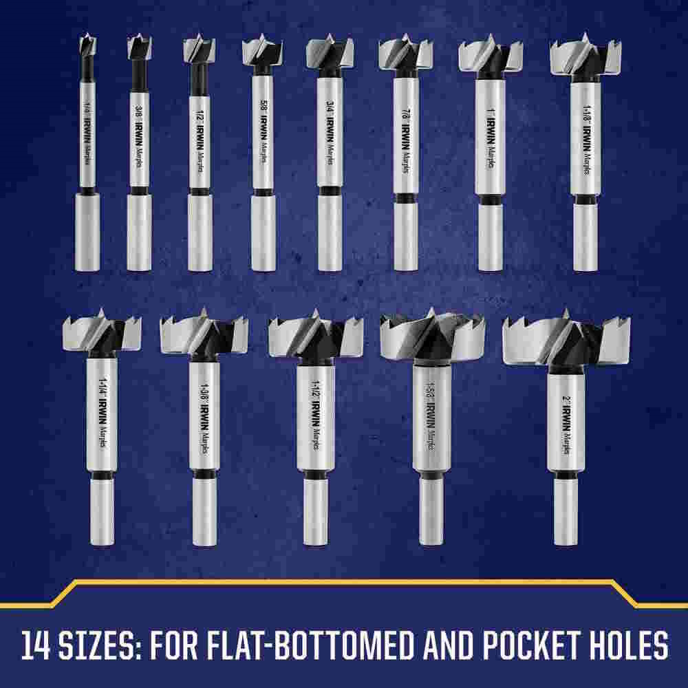 14PC FORSTNER BIT SET MARPLES INCLUDES: 1/4" (6.3mm), 1/4" (6.3mm), 3/8" (9.5mm), 1/2" (12.7mm), 5/8" (15.8mm), 3/4" (19.0mm), 7/8" (22.2mm), 1" (25.4mm), 1-1/8" (28.5mm), 1-1/4" (31.7mm), 1-3/8" (34.9mm), 1-1/2" (38.1mm), 1-5/8" (41.2mm), 2" (50.8mm)