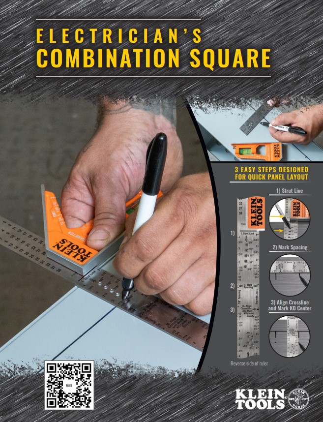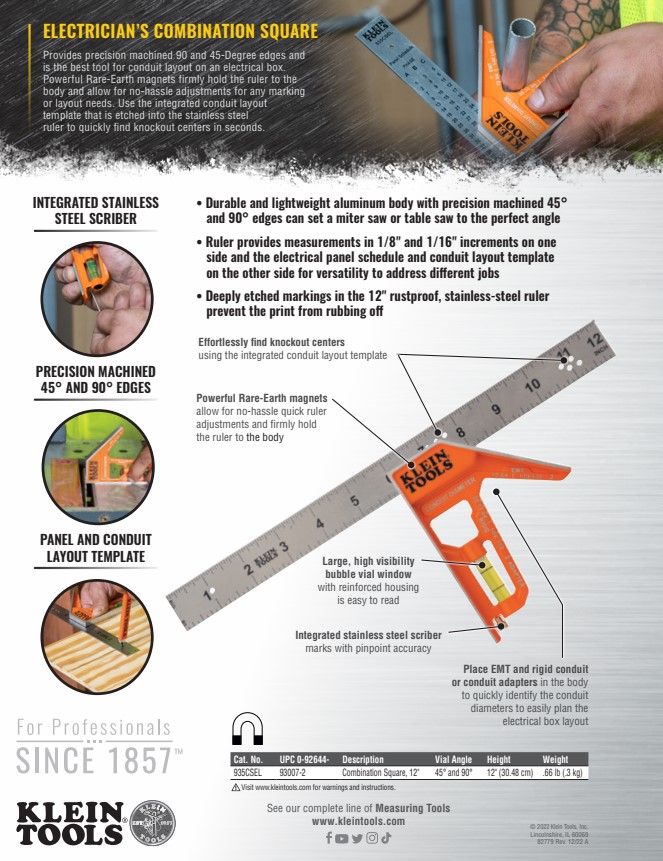 KLEIN Electrician's Combination Square w/ Electrical Box Layout Markings - 935CSEL