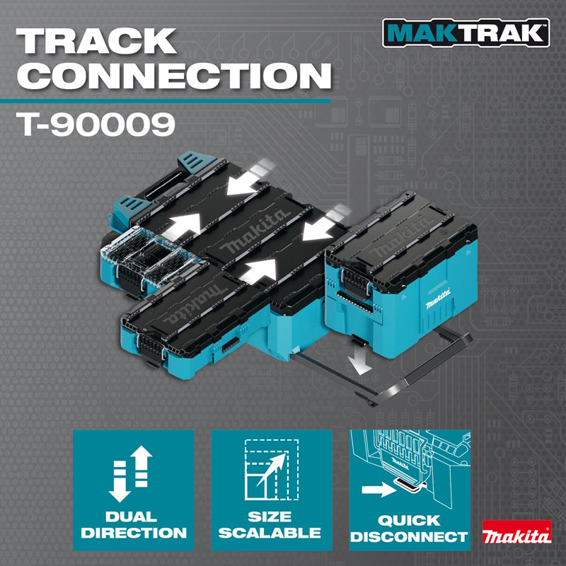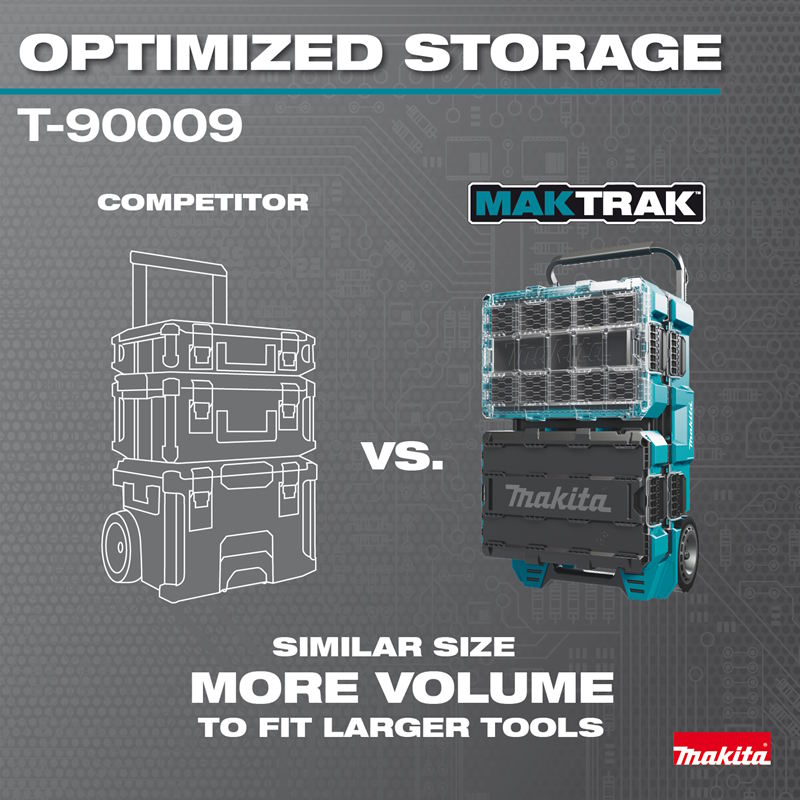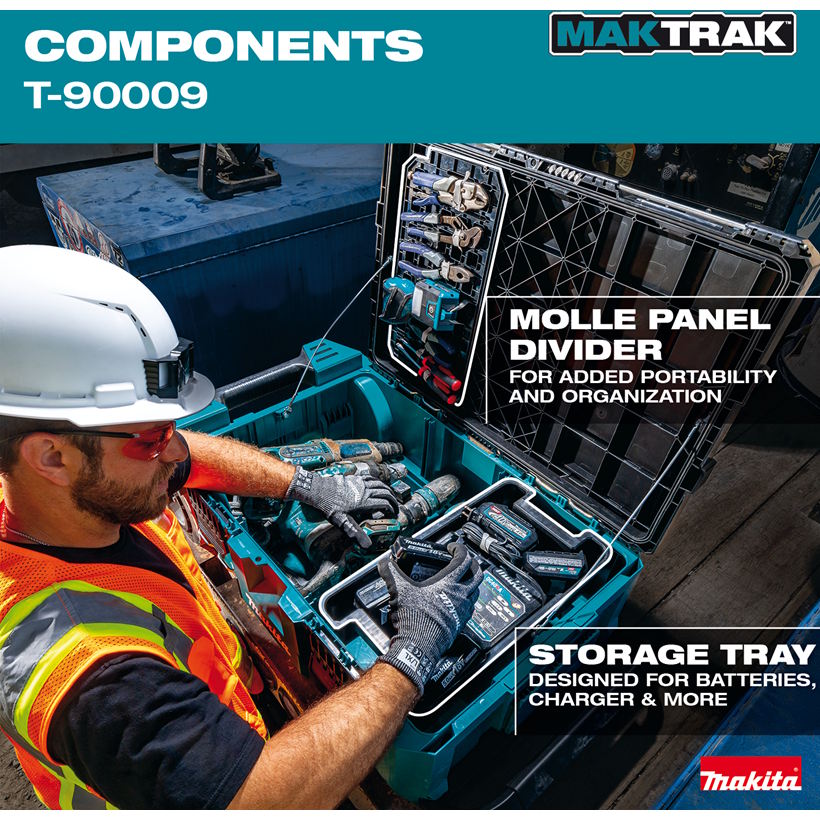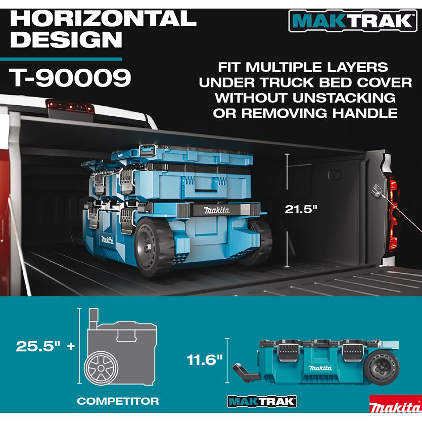 Makita MAKTRAK™ is the Next Generation in modular storage. The MAKTRAK™ Rolling Tool Chest (T-90009) is a modular storage solution to transport, access, store and organize job site equipment, with a horizontal design for maximum accessibility and to fit long tools. It has a holding capacity of 5,000 cu.in. and up to 250 lbs. The Rolling Tool Chest features a premium handle with Gecko Grips™ for easy truck/van loading and unloading, and 9" All-Terrain wheels for jobsite use. The horizontal design fits under a truck bed cover for ease of transport. It’s equipped with large glove-friendly latches for easy access, and the dual hinged removable lid allows access from both sides.