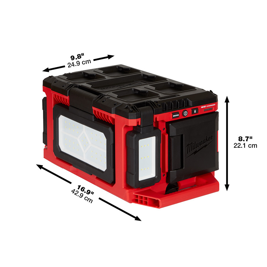 Milwaukee Tool's M18™ PACKOUT™ Light/Charger provides you with all day multi-directional lighting and charging. This portable light delivers 3000 Lumens of TRUEVIEW™ High Definition Output and is fully compatible with the PACKOUT™ Modular Storage System. Three independent rotating light heads allow for complete control over lighting direction whether you're using it on your PACKOUT™ stack or as a dedicated light off the stack. You can manage output and runtime on this portable work light with three different modes (All Lights, Main Panel, or Back/Front Lights), each including high, medium, and low settings for up to 31 hours of runtime with one M18™ REDLITHIUM™ XC 5.0 Battery. There is an AC input for all day runtime and M18™ Battery charging. This MILWAUKEE® PACKOUT Light allows you to charge devices with the 2.1AMP USB output and store small items inside the storage compartment.
