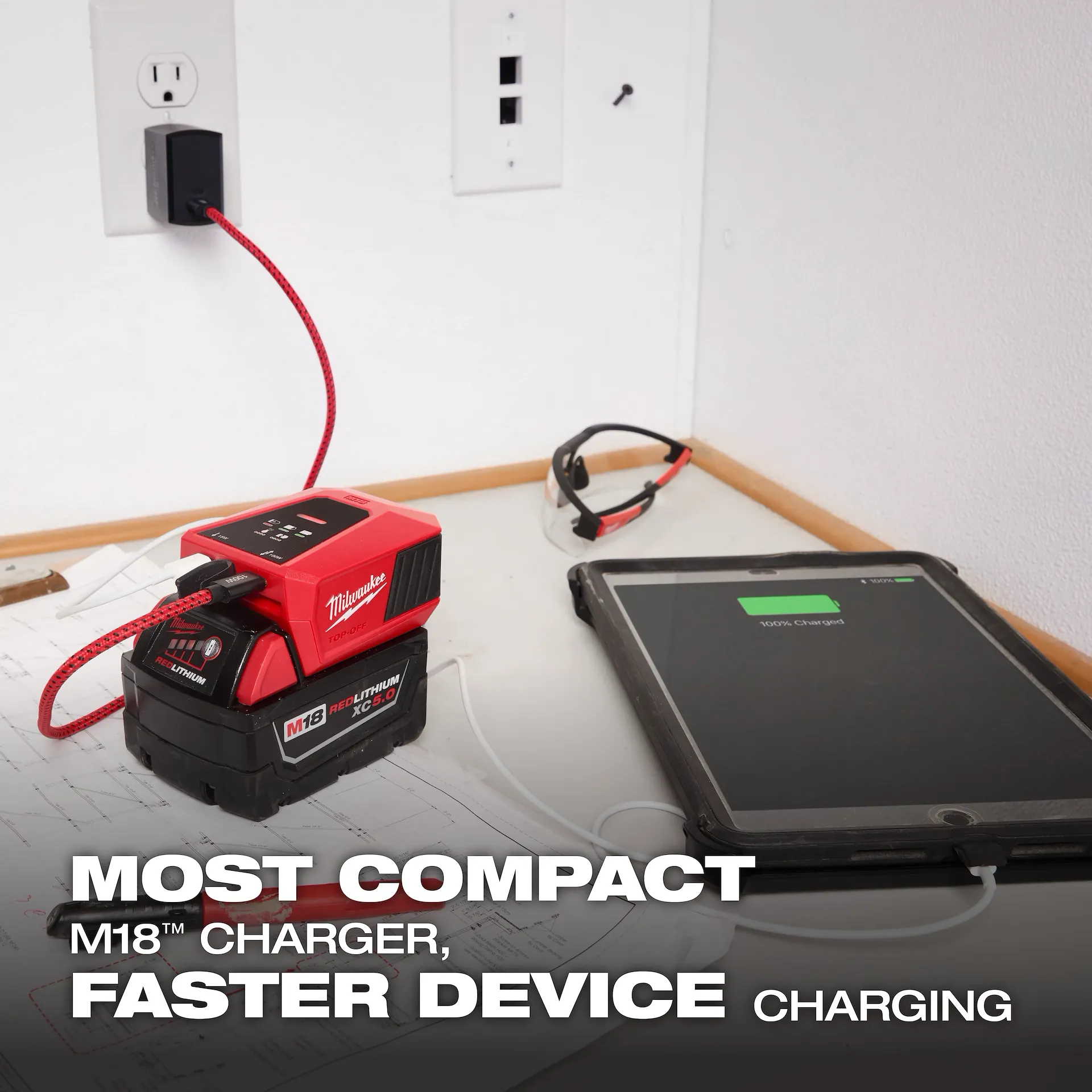 The MILWAUKEE® M18™ TOP-OFF™ Charger and Power Supply is the most compact M18™ battery charger, up to 65% smaller than traditional kitted chargers, offering a portable solution for charging Milwaukee Tool M18™ batteries. It features advanced USB-C PD technology for faster headlamps, phones, tablets, and laptop charging. It includes a 100W USB-C cord and a 65W wall charger, with dual USB-C ports for small electronics and larger devices. Compatible with all M18™ batteries, it can charge a phone up to five times with an M18™ XC 5.0 Battery. Recharging the M18™ XC 5.0 Battery takes approximately 105 minutes with a 65W wall charger.