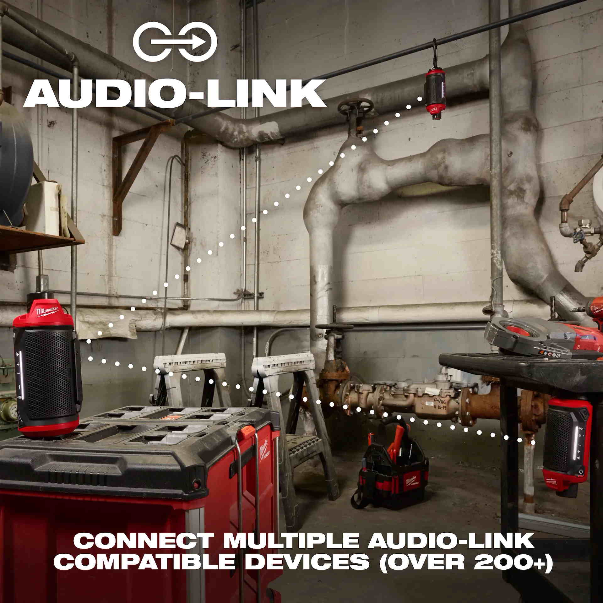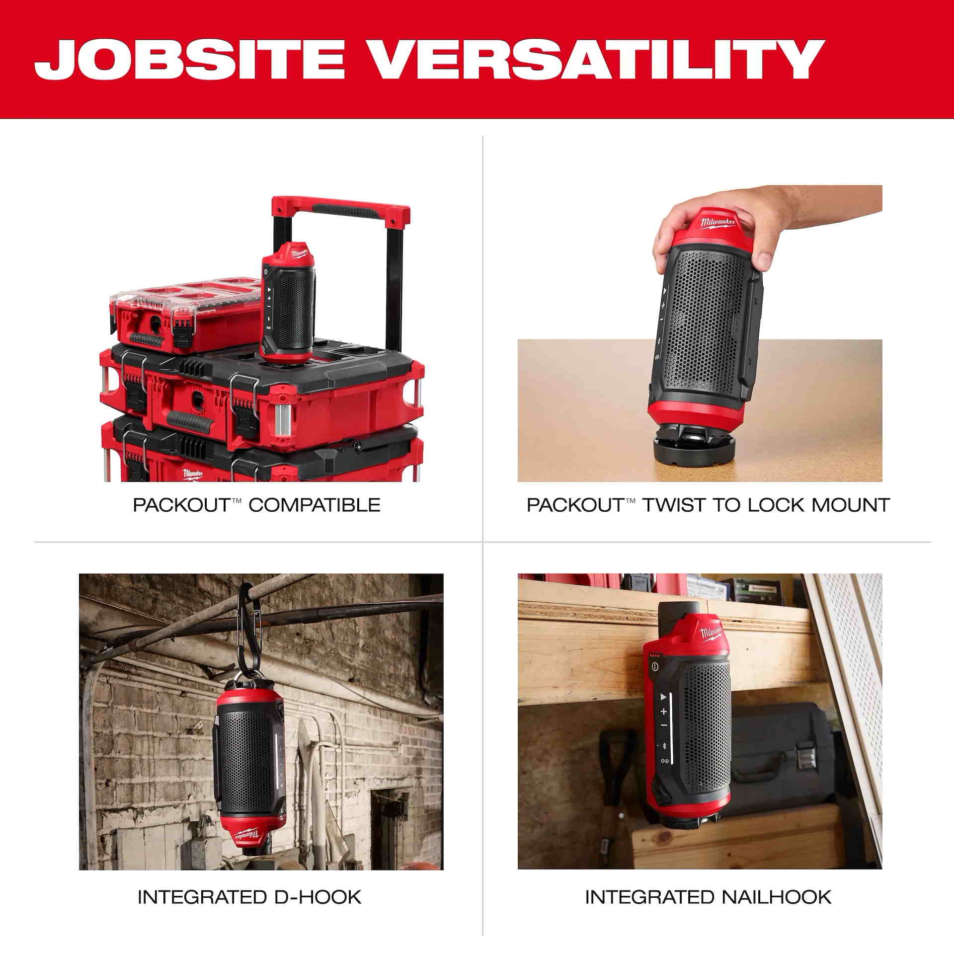 The M12™ Bluetooth® Jobsite Speaker w/ PACKOUT™ Compatibility delivers CLEAR, PORTABLE SOUND and JOBSITE VERSATILITY. The 3.5” woofer and high-frequency tweeter deliver optimized sound for personal workspaces. Bluetooth® 5.3 provides up to 200 feet of range to keep you connected throughout the jobsite. AUDIO-LINK allows you to play music through multiple compatible Milwaukee® devices (over 200+) creating a larger sound experience. The M12™ Bluetooth® Jobsite Speaker w/ PACKOUT™ Compatibility provides up to 10 hours of runtime at 100% volume on the M12™ REDLITHIUM™ XC4.0 Battery. The built-in equalizer settings allow you to customize the bass and treble to your preferred sound. Featuring twist-to-lock PACKOUT™ Connectivity, the speaker attaches to the top of PACKOUT™ solutions for secure storage and transport throughout the jobsite. Additionally, the kitted PACKOUT™ Mount, integrated nail hook, d-hook, and various listening orientations provide you with maximum JOBSITE VERSATILITY. This speaker withstands the most demanding jobsite environments with an IP64 rating. Charge up personal devices with USB-C 3.0A device charging wherever you go.