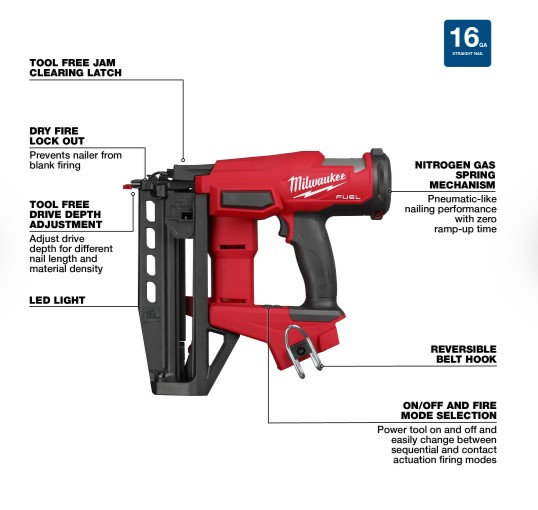 Milwaukee Tool's M18 FUEL™ 16 Gauge Straight Finish Nailer provides peak productivity at your jobsite, delivering unmatched nailing performance without the hassle of a compressor and hose. Leveraging our nitrogen air spring mechanism, the 16 Gauge Straight Finish Nailer allows you to consistently sink nails to your required depth in hard and soft woods while leaving clean nail holes, making for repeatable results and easy filling. The nitrogen air spring mechanism, combined with our POWERSTATE™ Brushless Motor and REDLINK PLUS™ Intelligence, delivers a pneumatic-like nailing response with zero ramp-up time from nail to nail, keeping you productive and efficient throughout your job. This cordless finish nailer features a compact and ergonomic design providing access to tight spaces where nailing is required while limiting fatigue when using the tool. When paired with an M18™ REDLITHIUM™ CP2.0 battery pack, this battery-powered nailer fires up to 700 nails per charge and is fully compatible with all M18™ REDLITHIUM™ batteries. The MILWAUKEE® M18 FUEL™ 16 Gauge Straight Finish Nailer delivers the pneumatic performance that professional carpenters and remodelers demand, with the freedom and convenience of cordless.