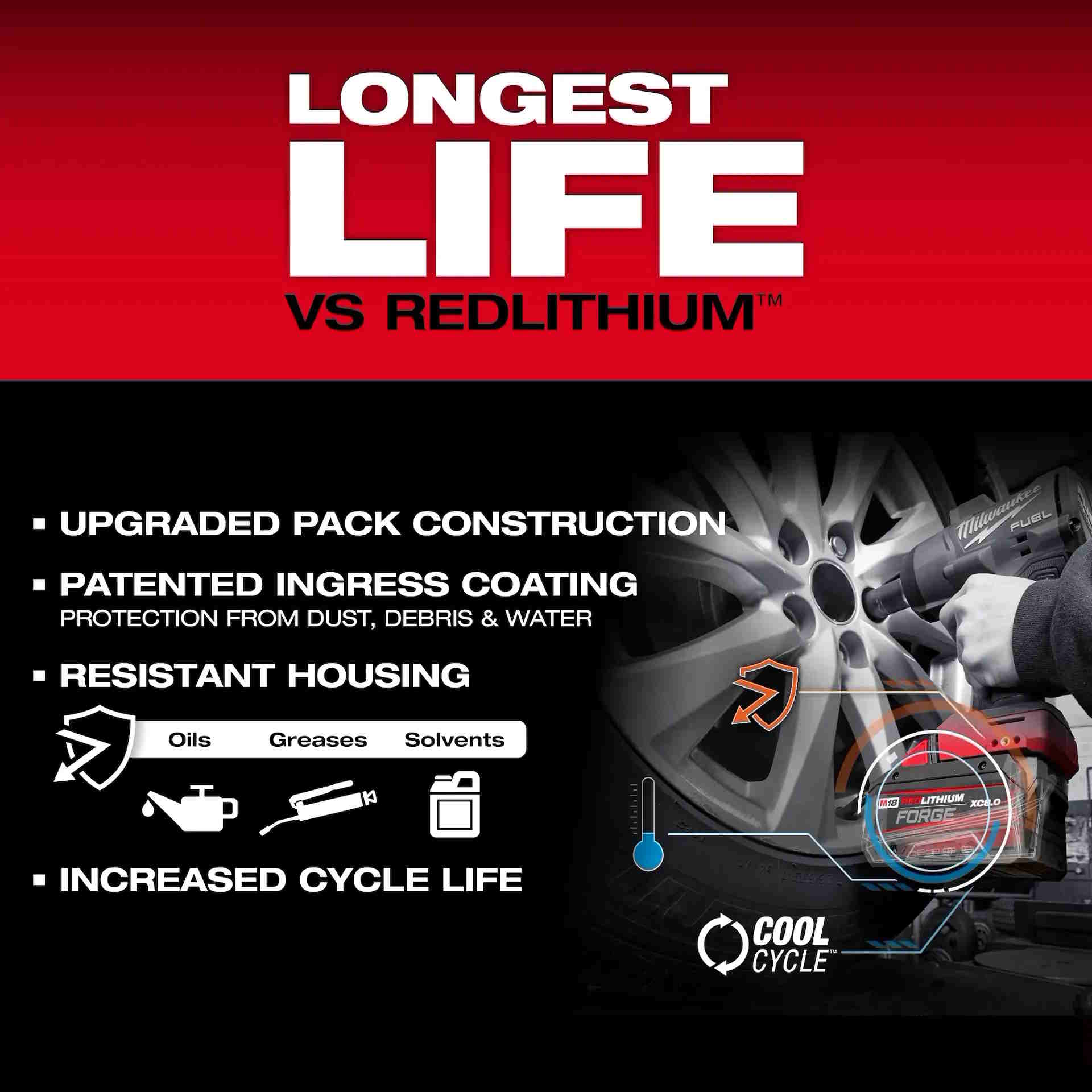 Milwaukee Tool's M18™ REDLITHIUM™ FORGE™ XC8.0 Starter Kit delivers HIGH OUTPUT™ 12.0 power in a smaller size and the longest life vs REDLITHIUM™ batteries. REDLITHIUM™ FORGE™ are Milwaukee's most powerful, fastest charging, and longest life batteries. The REDLTIHIUM™ FORGE™ XC8.0 delivers 8 amp hours of runtime, but with the same power as the M18™ REDLITHIUM™ HIGH OUTPUT™ HD12.0 in a smaller size and lighter weight design. This lithium-ion battery has the longest life, the most recharges, and the best performance over the life of the battery. It is also designed with resistant housing for increased protection against exposure to common oils, greases, and solvents. Built-in REDLINK™ Intelligence protects the battery from overloads, preventing you from damaging your cordless power tools in heavy-duty situations. The REDLITHIUM™ FORGE™ XC8.0 battery is fully compatible with 275+ M18™ solutions. Our M18™ & M12™ Rapid Charger charges battery packs up to 40% faster, reducing your downtime and maximizing your productivity. The battery charger accepts all MILWAUKEE® M18™ and M12™ batteries, providing a charging upgrade for both systems. The battery charger communicates directly with your battery pack to monitor cell voltage, temperature and charge status to ensure a full charge.