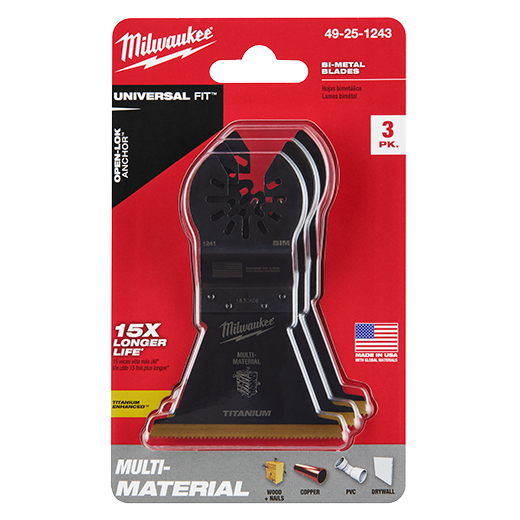Milwaukee Tool's Universal Fit OPEN-LOK™ Titanium Enhanced Bi-Metal Multi-Material Oscillating Multi-Tool Blades are made from premium high-speed steel. These bi-metal blades are ideal for cuts in wood, nails, PVC, and drywall. The MILWAUKEE® bi-metal multi-tool blades are enhanced with titanium to deliver faster cuts than the previous generation, featuring more teeth with an increased cutting width and a deeper plunge cut. These oscillating multi-tool blades are designed and made in the USA with global materials.