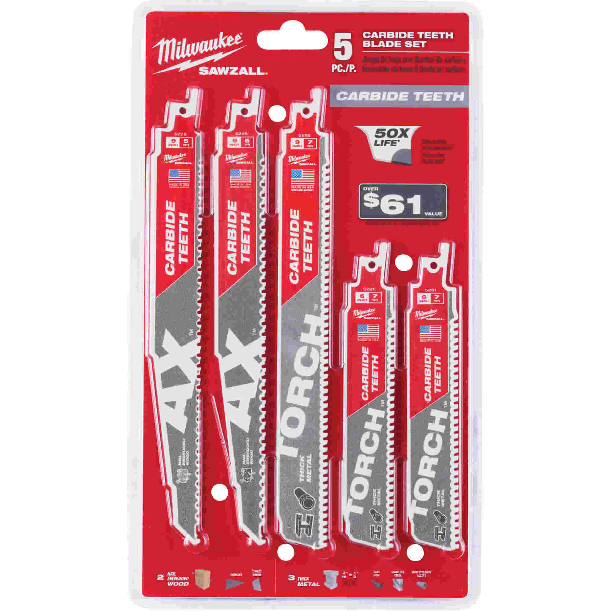 The AX with Carbide Teeth, engineered to deliver long life in the toughest applications. These new blades will deliver 30X longer life over standard bi-metal blades. The Ax with Carbide Teeth features optimized carbide tipping technology that delivers extreme life. A fast, aggressive 5 TPI blade design allows for the fastest cutting in nail-embedded wood and a wide range of residential material. In addition, The Ax with Carbide Teeth will feature Milwaukee patented features Nail Guard and Fang Tip. Nail Guard allows the user to Rip Nails Not Teeth, delivering extreme durability. The Fang Tip provides the faster plunging on any wood. The Ax with Carbide Teeth is optimized for Cordless Recip Saws delivering over 25% more cuts per charge.