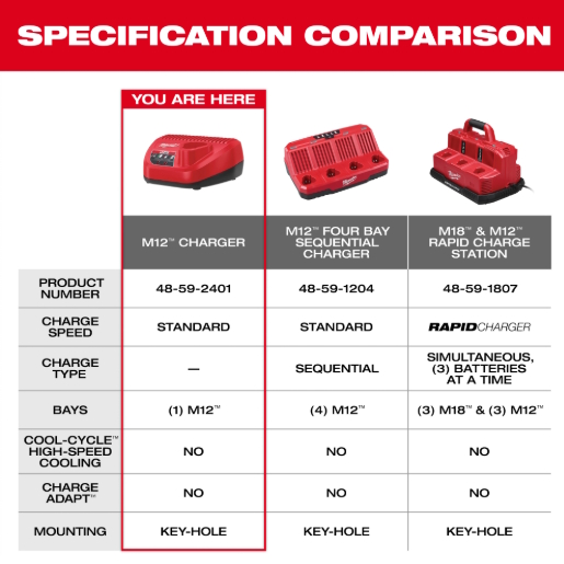 Quickly charges all M12™ batteries. Power up your M12™ RED LITHIUM™ and M12™ Lithium-Ion batteries in less than an hour with the M12™ Lithium-Ion Charger. It communicates directly with the battery pack to manage charges and features an easy-to-load design. The charger’s slim profile requires little bench-top room. Monitor battery charges for all of your M12™ cordless tools with the onboard indicator light.