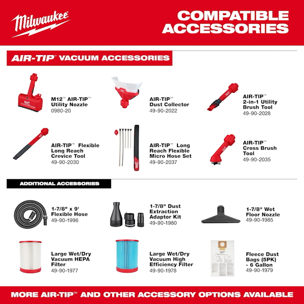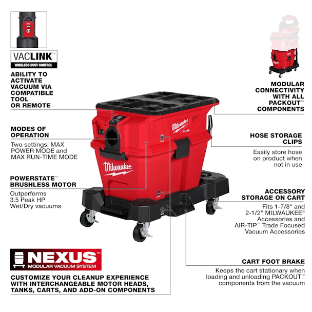 Our M18 FUEL™ NEXUS™ 6 Gallon Wet/Dry Vacuum w/ PACKOUT™ Compatibility & VACLINK™ DELIVERS CORDED PERFORMANCE with OVER 40 MIN OF CONTINUOUS CLEANING, allowing users to CLEAN ANYWHERE, WITH NO CORD LIMITATIONS. The POWERSTATE™ Brushless Motor and REDLINK PLUS™ Intelligence deliver 95 CFM and the power to clean up more common jobsite debris than 3.5 Peak HP wet/dry vacuums. On an M18 REDLITHIUM™ FORGE™ HD12.0 battery pack, this vacuum can clean up to 1,800 sqft. on a single charge or up to 44 minutes of continuous cleaning on max run-time mode. This cordless vacuum eliminates corded hazards like slips, trips, and falls and eliminates the need to search for power on the job site. This vacuum is quieter than leading corded competitors and ideal for any environment. This vacuum is part of the NEXUS™ Modular Vacuum System. It allows users to customize their cleanup experience with interchangeable motorheads for varying power, tanks for holding capacity, carts for mobility, and add-on components to enhance the cleanup experience. The top of the vacuum is fully compatible with the Milwaukee® PACKOUT™ Modular Storage System. It is also equipped with VACLINK™ Wireless Dust Control, allowing compatible tools and vacuums to connect to each other, allowing users to activate their vacuum remotely. The included VACLINK™ Wireless Dust Control Remote provides on/off power control at the hose end, maximizing cleanup efficiency and eliminating wasted run-time.