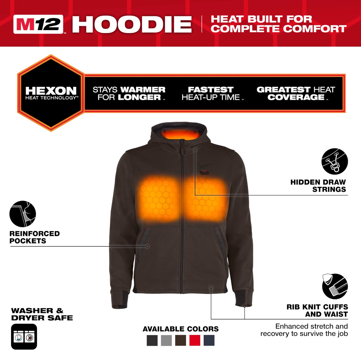 Milwaukee Tool's M12™ Heated Hoodie delivers HEAT BUILT FOR COMPLETE COMFORT. Powered by Milwaukee’s NEW HEXON HEAT TECHNOLOGY™, this hoodie STAYS WARMER FOR LONGER in all temperatures, delivers the FASTEST HEAT UP TIME and offers the GREATEST HEAT COVERAGE throughout the garment. Whether facing freezing outdoor temperatures or navigating spaces with minimal heat indoors, this hoodie adapts to its environment to deliver effective heat in any condition. By integrating HEXON HEAT TECHNOLOGY™ and an improved fabric design, optimal comfort and mobility are achieved. With ground-up developed cotton/polyester fleece fabric, this MILWAUKEE® hoodie provides warmth and a full range of motion whether worn as a mid-layer or exterior layer. The hidden battery pass-thru pocket allows for front or back battery placement, increasing versatility depending on the situation. Our Milwaukee® Heated Gear is developed in collaboration with feedback from users across the trades through continuous jobsite research.