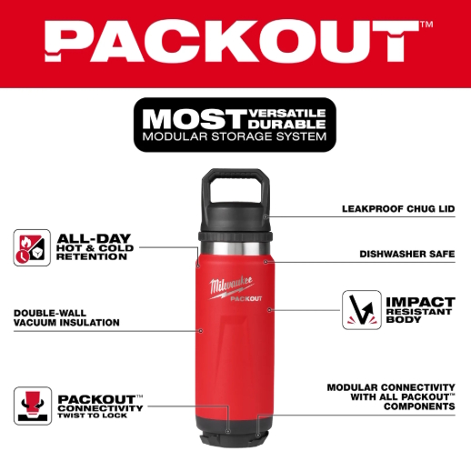Milwaukee Tool's PACKOUT™ 24oz Insulated Bottle with Chug Lid features twist-to-lock PACKOUT™ Connectivity so you can attach your bottle to the top of PACKOUT™ solutions, allowing for secure drink storage on the jobsite. The PACKOUT™ 24oz Insulated Bottle with Chug Lid has double wall vacuum insulation, keeping drinks hot or cold all day. The impact-resistant body is constructed with thicker 18/8 stainless steel to withstand harsh jobsite environments. Our dishwasher-safe 24oz Insulated Bottle comes with a leakproof chug lid. MILWAUKEE® PACKOUT™ is the industry's most versatile and durable modular storage system.