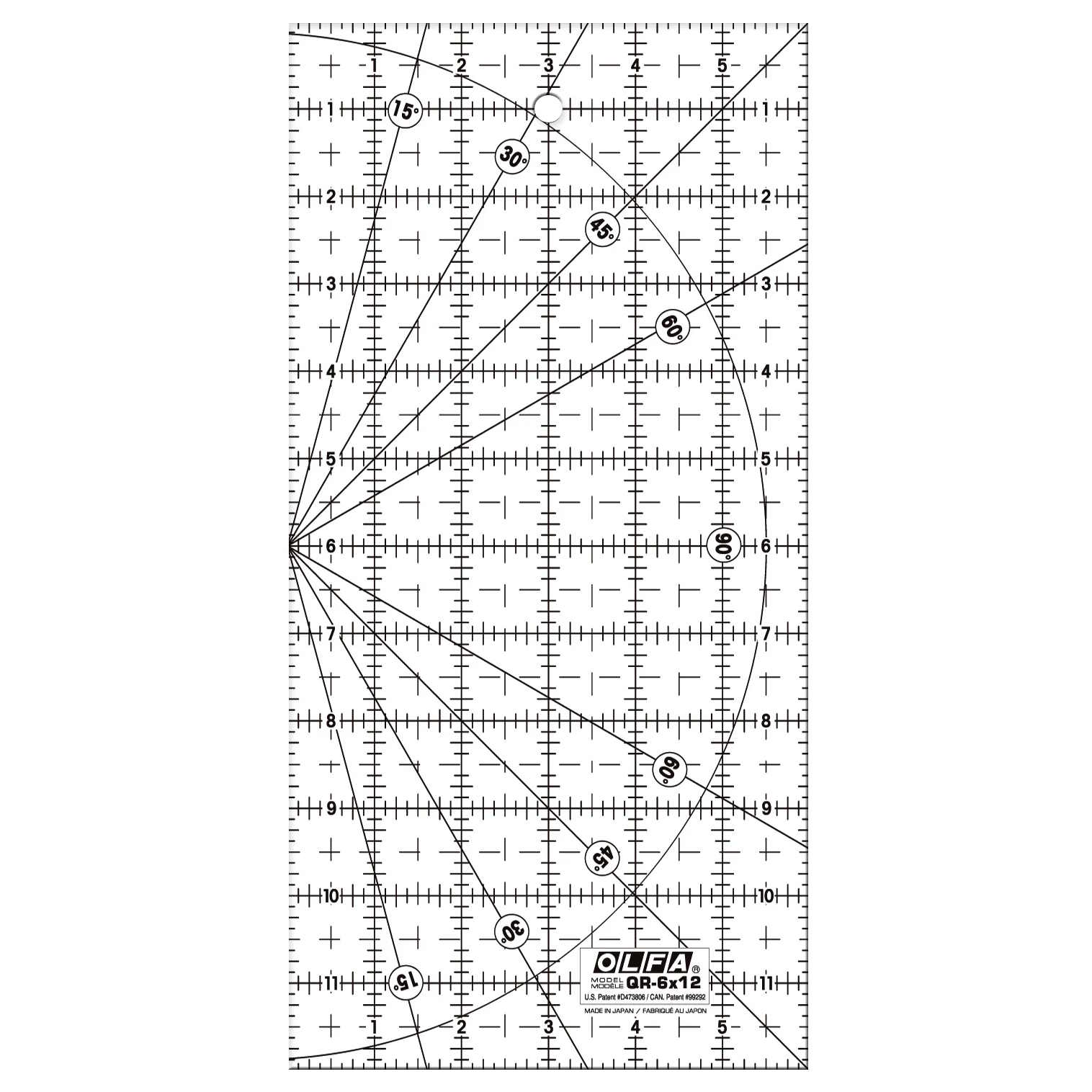 The OLFA QR-6x12 6" x 12" Frosted Advantage™ Acrylic Ruler is the perfect craft ruler for intricate angles and precise turns. Unlike many acrylic rulers, this quilting ruler features precise patented pivot point angles for accurate shaping in addition to the straight measurements.