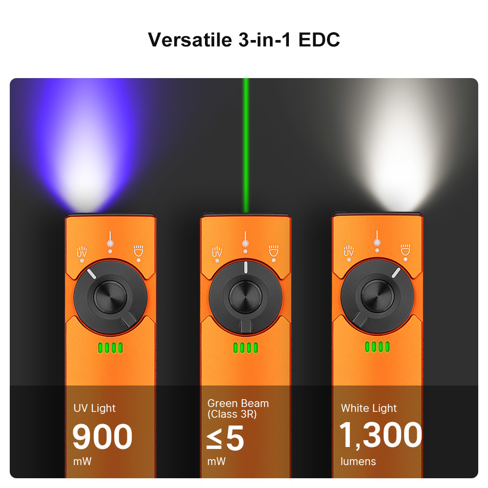 Versatile 3-in-1 EDC: Olight's FIRST rechargeable flashlight that combines 1,300lm white light, 900mW UV light, and Class 3R green laser, offering versatility for a wide range of applications.