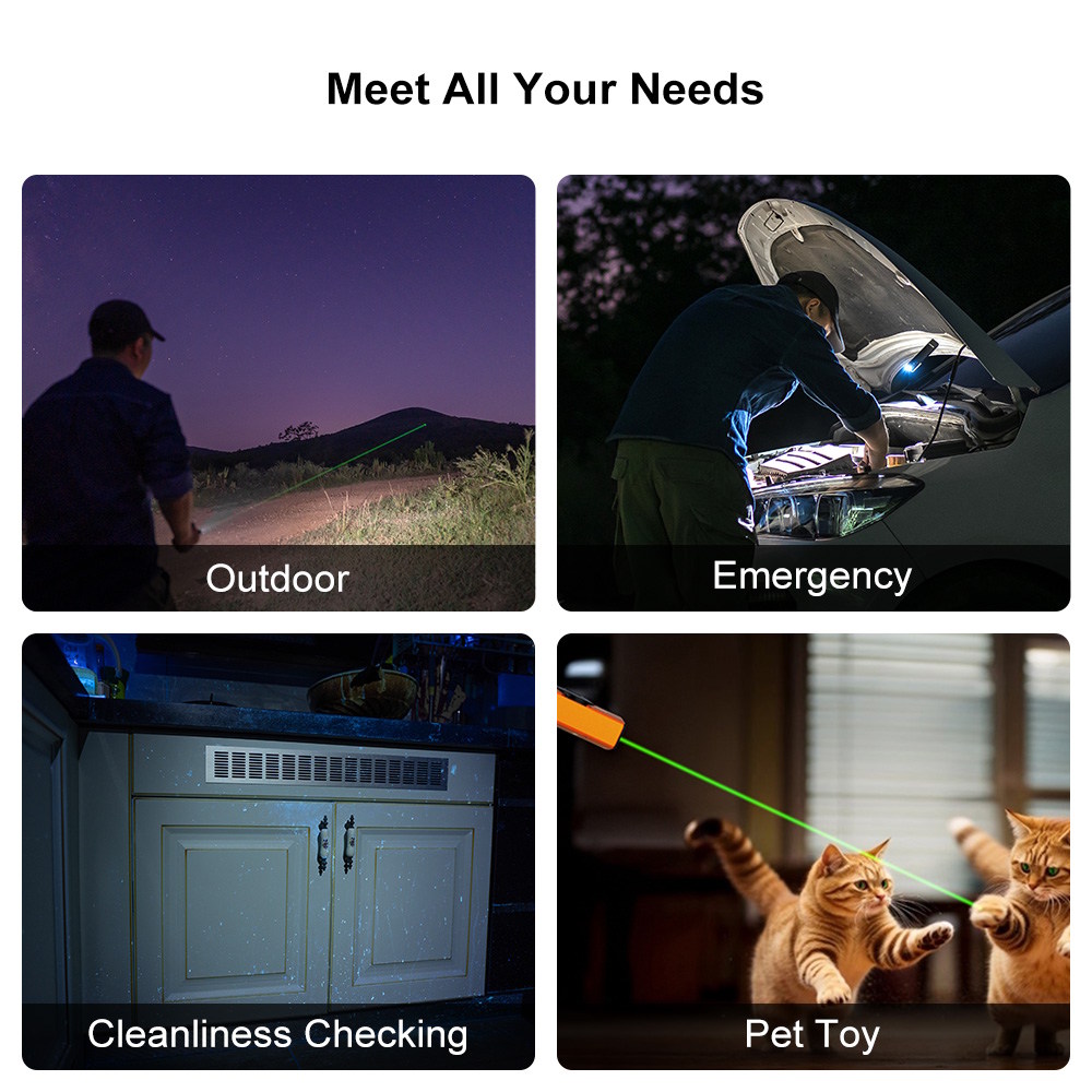 Pro White Light & Green Laser: White light for daily illumination, laser for pet play / presentation, and the white light and laser can work in tandem for providing targeted point plus overall brightness.