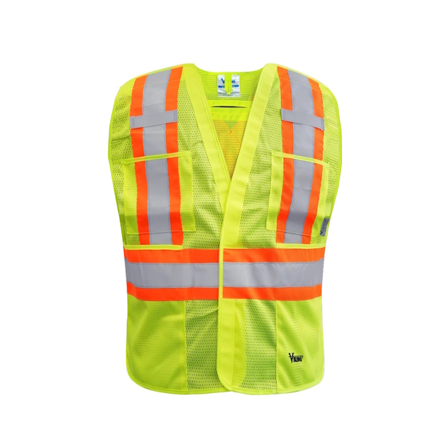 Horizontal 360 degrees stripe around the body plus 2 vertical stripes in the front and an X in the back providing the worker total protection as they move to be seen from all angles