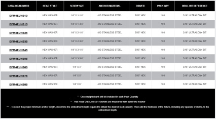 The UltraCon SS4 anchor is a 410 stainless steel screw anchor for light to medium duty applications in concrete and masonry block base materials. The screw anchor is fast and easy to install and provides a neat, finished appearance. UltraCon SS4 anchors feature a Stalgard coating and provide enhanced corrosion resistance over carbon steel fasteners.