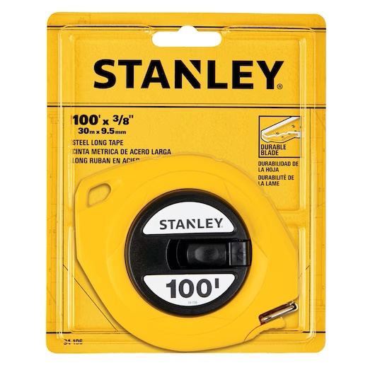 The STANLEY® 100 ft. Steel Long Tape features a polymer-coated 3/8 in. blade packed into a compact ergonomic case. Easy-wind drums allows easy blade retraction and the end hook fits neatly into the contoured case for safe storage. This compact long tape makes measuring distances quick and easy with the accuracy you can expect from STANLEY tape measures.