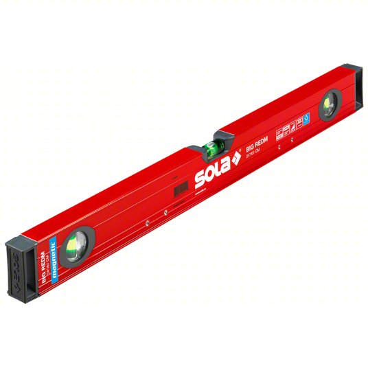 24" (61 cm) and 48" (122 cm) equipped with: 1 horizontal vial each, 2 vertical vials each, 2 through-handle openings each, 2 coated measuring surfaces each.