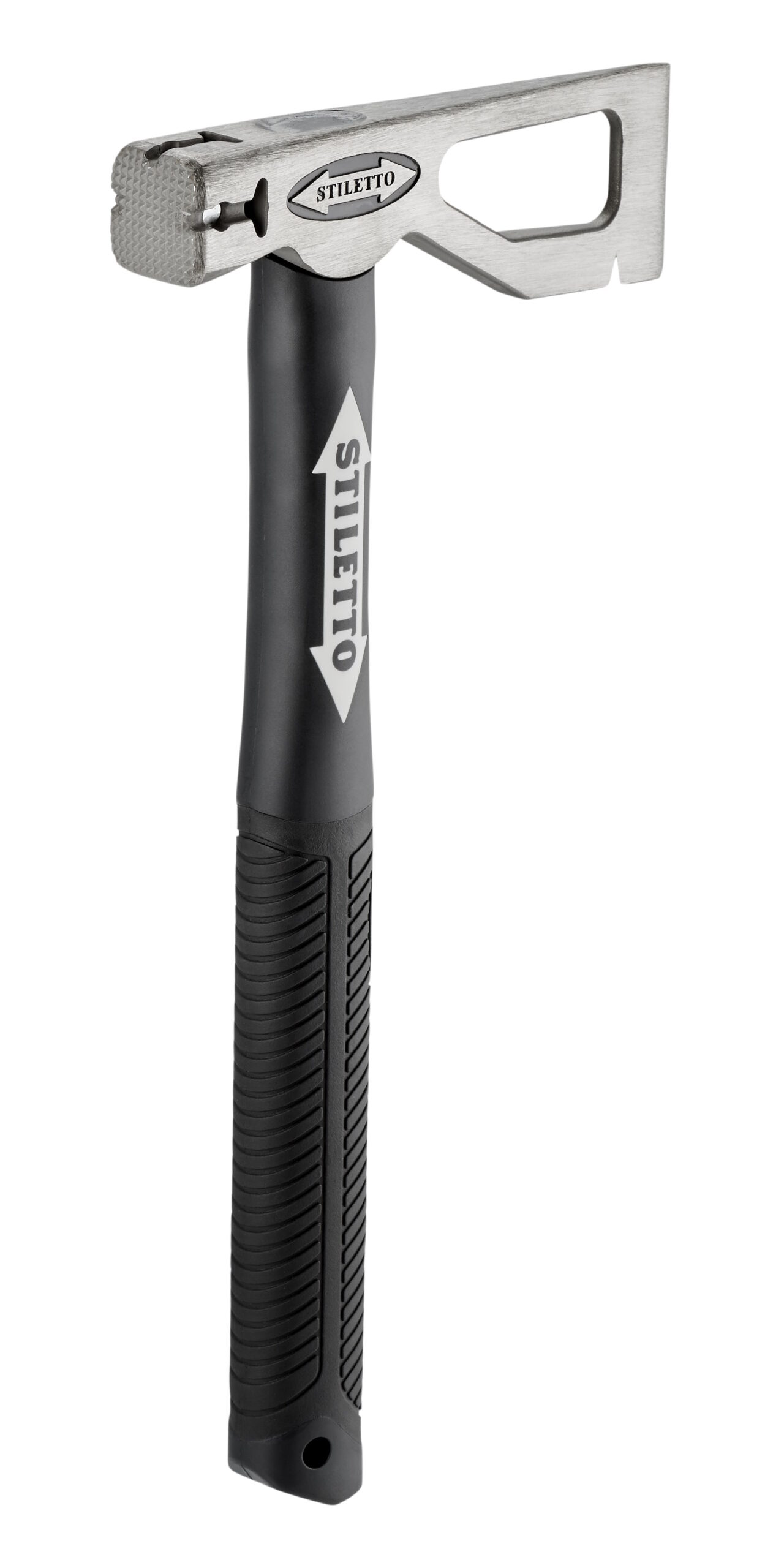The STILETTO® 10oz Titanium Roofing Hatchet with 13.5" Fiberglass Handle is a perfectly balanced Roofers/Lathers Hatchet. This axe hits like a 16oz steel hammer with 45% less weight and 10x less recoil shock. This Lathers Axe features a magnetic nail starter.
