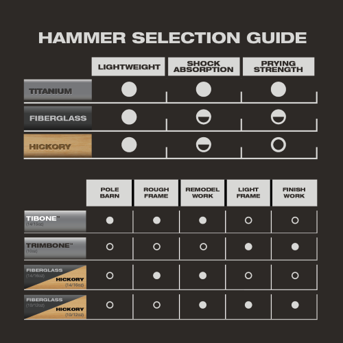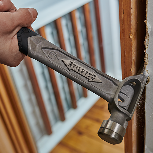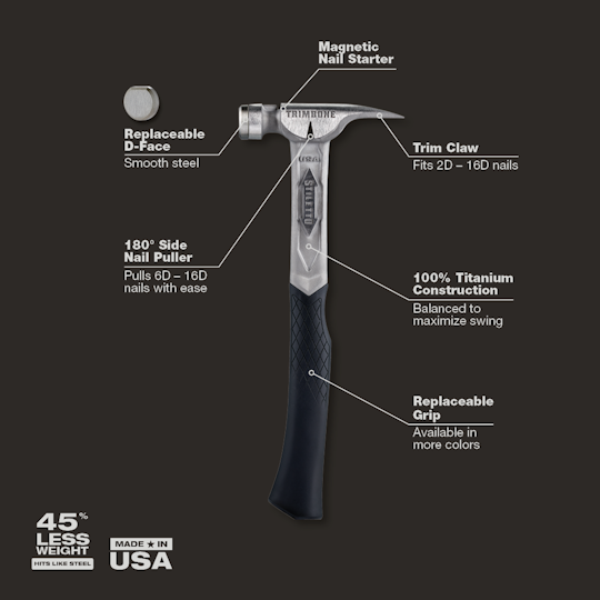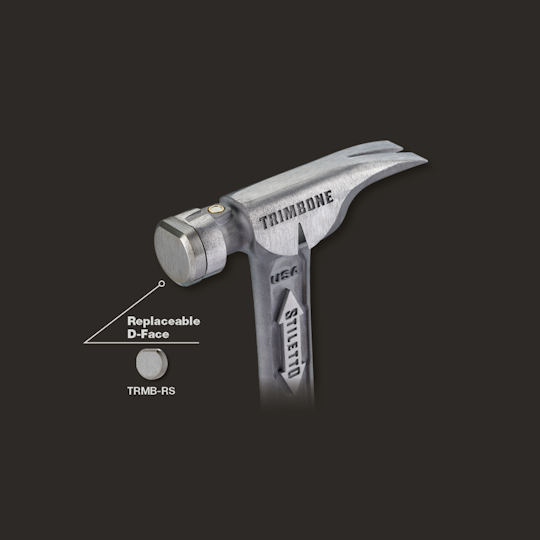 The STILETTO® 10oz TRIMBONE™ Hammer with Smooth Steel Face and Curved Handle is designed for finish with specialized features. This All-Titanium hammer is 45% less weight and hits like steel. The compact D-Face and Trim Claw are ideal for tight spaces. The TRIMBONE™ also features a replaceable colored grip and steel face, extending the life of the hammer and providing a personal touch. The 180° side nail puller is ideal for 2D-10D nails but has the power to pull up to 16D.