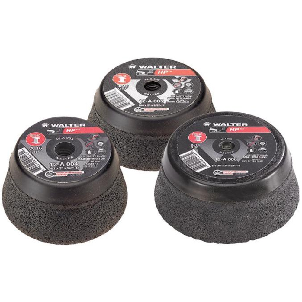 Grind rough materials with this type 11 HP cup wheel that has a deeply anchored wrap-around steel hub for maximum safety and long life. Each wheel has a maximum RPM of 9,100 per minute while the wheel measures four inches and the arbor hole measures 5/8"-11.